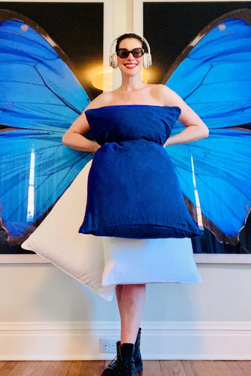 Anne Hathaway 是一位難得的自拍照愛好者,最近她參與現時火熱的#PillowChallenge 時,以別出心裁的方法引起了大家的注意。Hathaway 綁了一個藍色枕頭在身上,並將她的公主日記中的角色 Mia Thermopolis 帶到了病毒造型比賽中。 她重新製作了2001年迪斯尼電影的海報——配以太陽鏡、耳機及蝴蝶背景,並從她的合作女演員Julie Andrews那裡借了一句經典句子 “A Queen is never late; everyone else is simply early”。