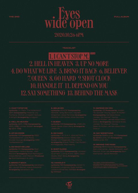 韓國9人女團Twice在今年6月發佈了迷你專輯,並憑藉《More & More》橫掃各大音源排行榜。時隔4個月她們火速再度回歸,並將帶來第二張正規專輯《Eyes Wide Open》,日前也公佈了集體造型照以及完整歌單,為回歸造勢。