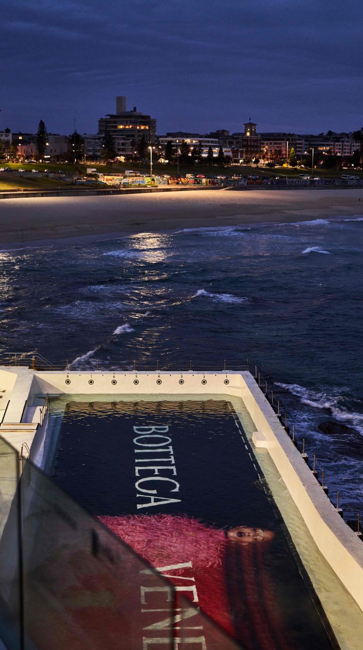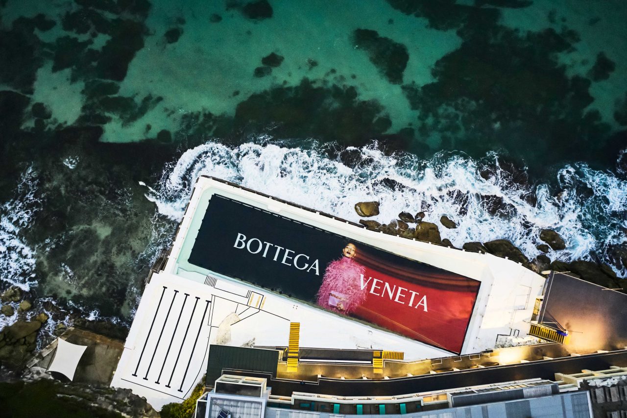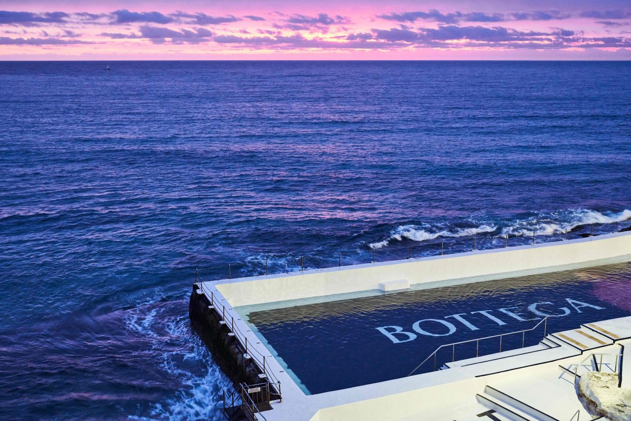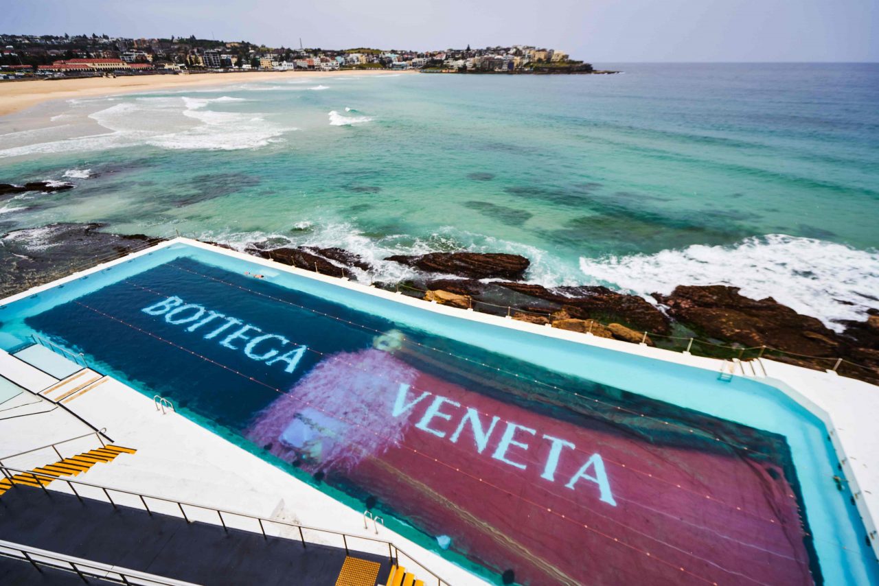 是次 Bottega Veneta 選擇在澳洲悉尼最具標誌性的海灘之一邦迪海灘 (Bondi Beach) 的 Bondi Icebergs 露天游泳池底部,展示了品牌最新 廣告,照片由倫敦時尚攝影師 Tyrone Lebon 拍攝,以 Dede Mansro 為主角,穿上 Salon 02 系列的服飾。此外,品牌又在位於悉尼的輕軌和墨爾本輕軌的電車外,抹以醒目的斑馬紋設計,再一次以創意形式 「take over」 了這座城市。