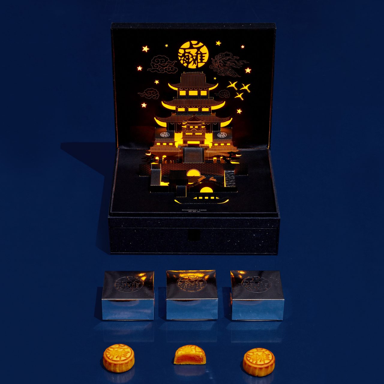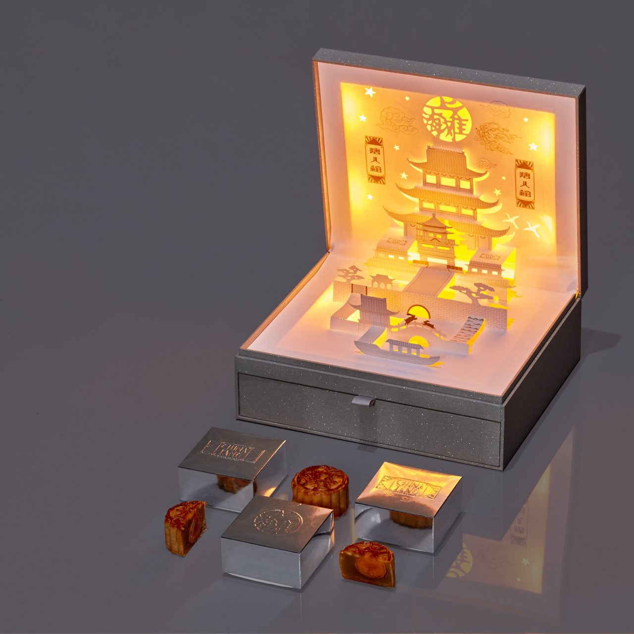 而「上海灘 × 唐人館限量版月餅禮盒」則以鑽石銀包裝,內裏的中秋夜景紙雕以印金效果襯托,配合內置發光效果,顯出層次。每盒共有六個傳統本地製造的唐人館蛋黃白蓮蓉月餅,入口甘香清甜。