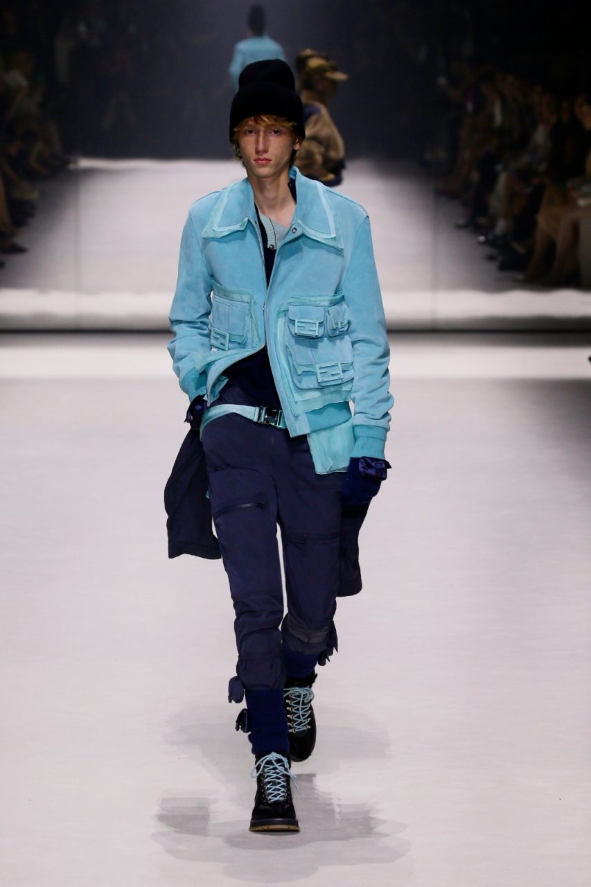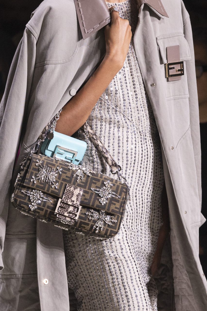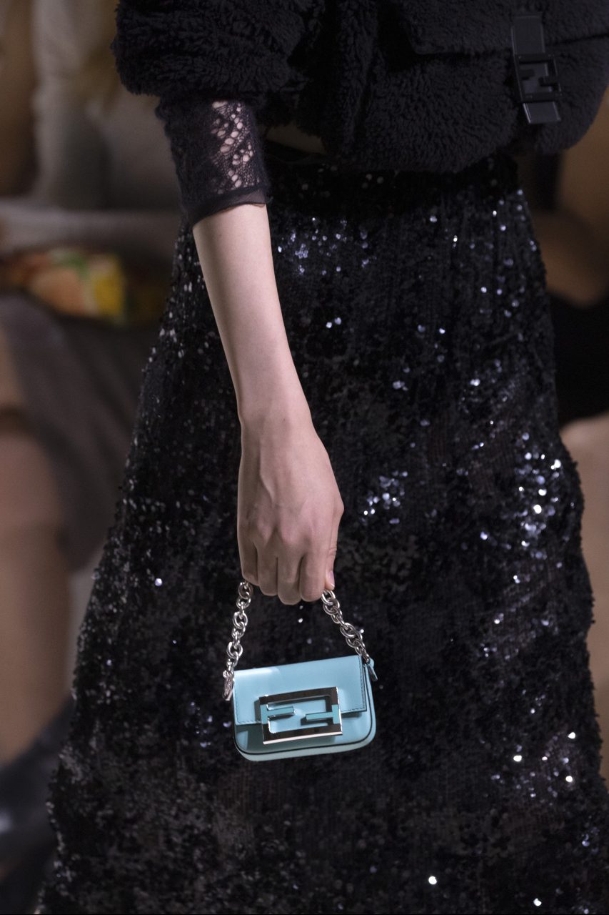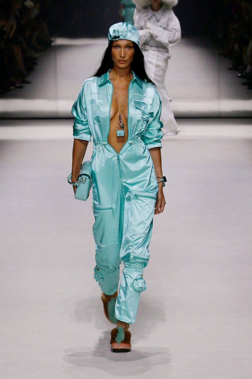 除了配飾和首飾, 其標誌粉藍色也出現在服裝上,Bella Hadid 一身 Tiffany Blue 連身褲配襯胸 前 Tiffany Baguette 銀飾,有型至極。這份多變的型格,Silvia Venturini Fendi 也不忘留給 Fendi 男裝。充滿戶外功能元素的服裝上,與女裝一樣綴有 Baguette 裝飾口袋,Porter 的實用本色也為系列注入剛陽氣息。Porter 耐磨但不失奢華美感的黏合尼龍和精準日本工藝, 帶來長青的斜孭袋和 Bum Baguette 腰包,還有潮流感十足的背囊款式,下季大家恐怕要爭崩頭。