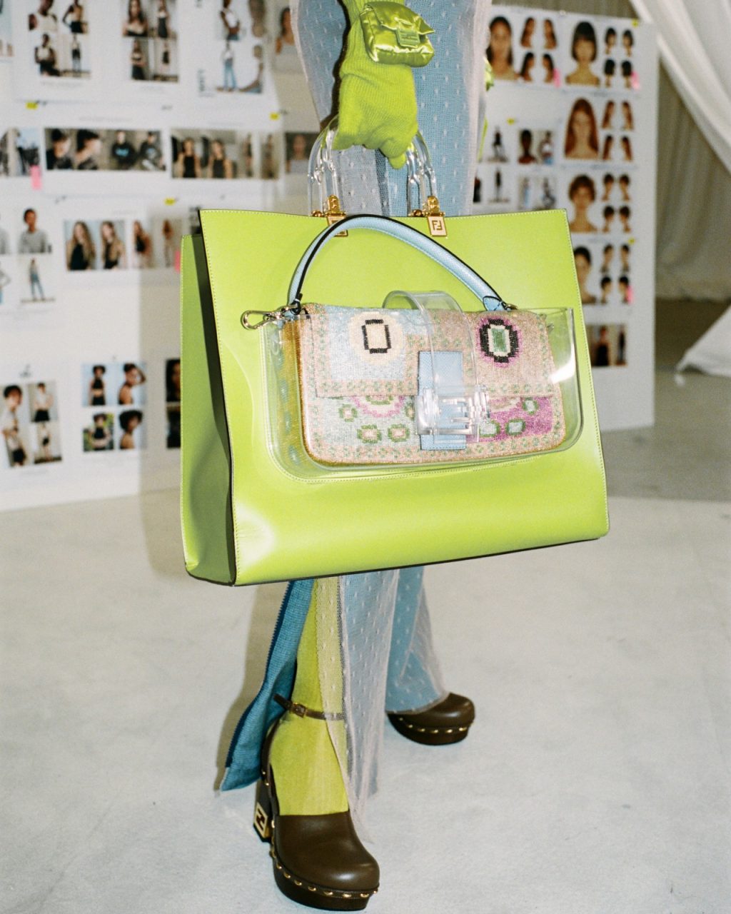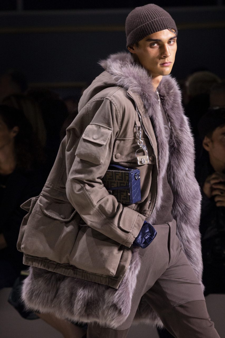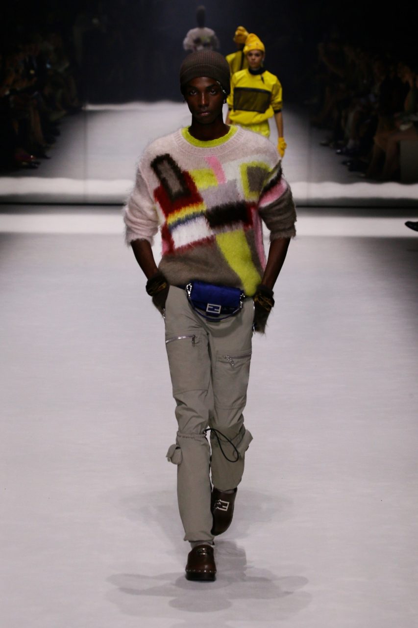 除了配飾和首飾, 其標誌粉藍色也出現在服裝上,Bella Hadid 一身 Tiffany Blue 連身褲配襯胸 前 Tiffany Baguette 銀飾,有型至極。這份多變的型格,Silvia Venturini Fendi 也不忘留給 Fendi 男裝。充滿戶外功能元素的服裝上,與女裝一樣綴有 Baguette 裝飾口袋,Porter 的實用本色也為系列注入剛陽氣息。Porter 耐磨但不失奢華美感的黏合尼龍和精準日本工藝, 帶來長青的斜孭袋和 Bum Baguette 腰包,還有潮流感十足的背囊款式,下季大家恐怕要爭崩頭。