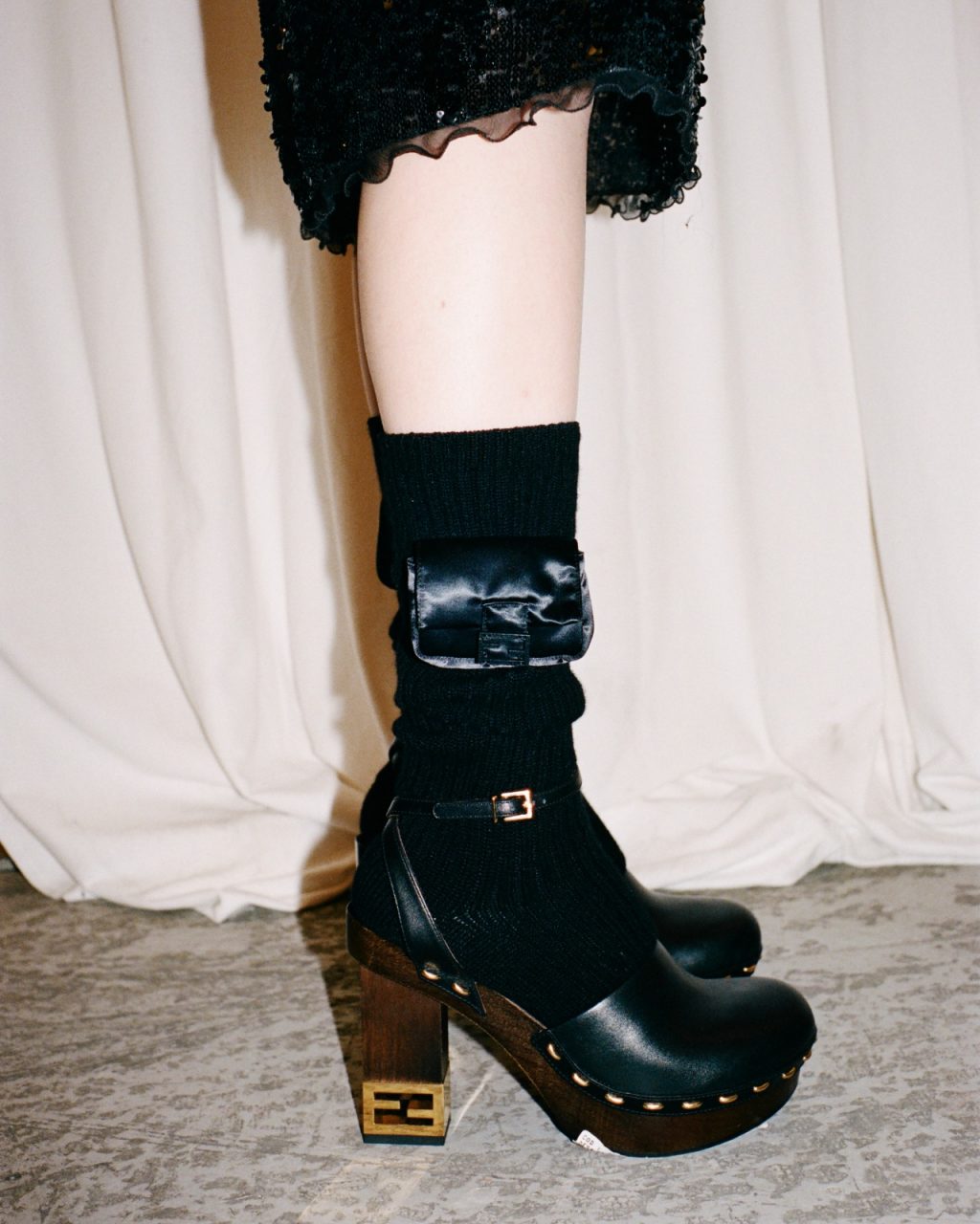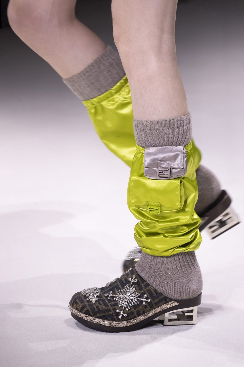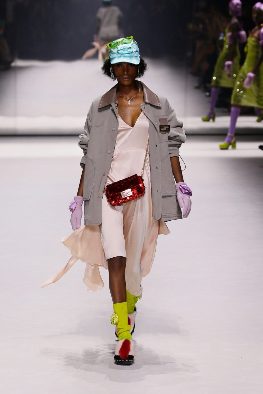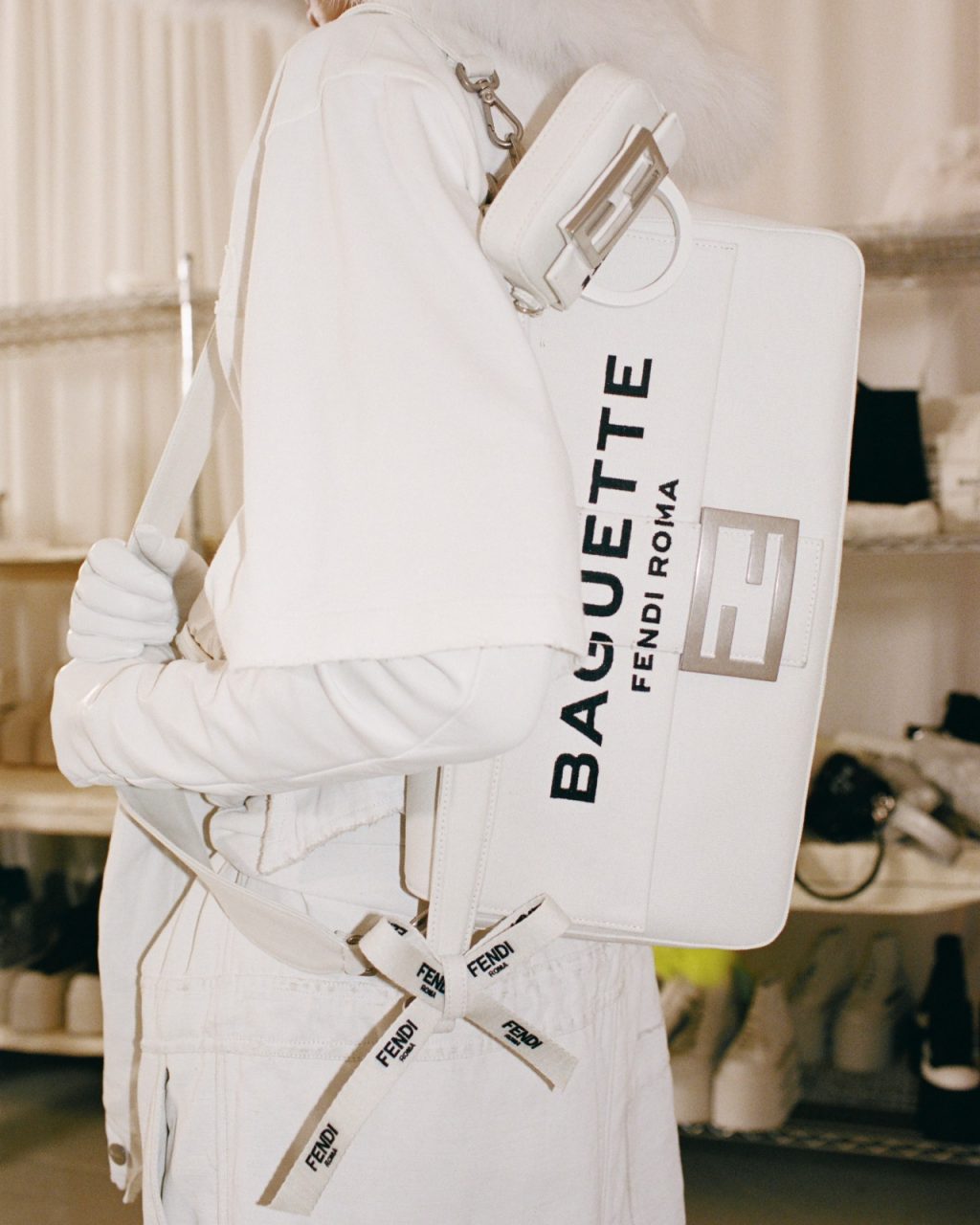 為了向 Baguette 致敬,Fendi 將手袋的實用基本格調註釋成多個口袋布局,貫穿整個系列。除與 Marc Jacobs 聯乘,品牌也將其他系列元素帶進 Baguette 的宇宙:將 Baguette 結合近年熱賣的手提袋 Sunshine Tote,為兩者帶來驚喜。在手套、帽款、半截裙、毛衣上,佈滿這款獨樹一幟的手袋化作迷你和小巧口袋的裝飾元素,以剪絨貂皮或亮面皮革、多層珠片和不對稱剪裁真絲在底部堆疊出層次的連帽風褸,以及用絲綢縫製的護腿, 散發一抹性感的迷人風采,將街頭風格與奢華手袋細節完美融合。
