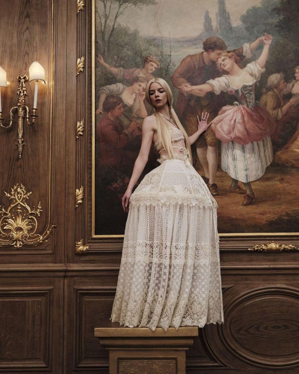 作為 Dior 品牌大使,Anya Taylor Joy 也率先換上了由 Maria Grazia Chiuri 設計的 2023 春夏系列一款裙撐半身裙出席了於英國的活動,並在名畫前留影拍照,仿如穿越時空出現的主人公,時尚而優雅。