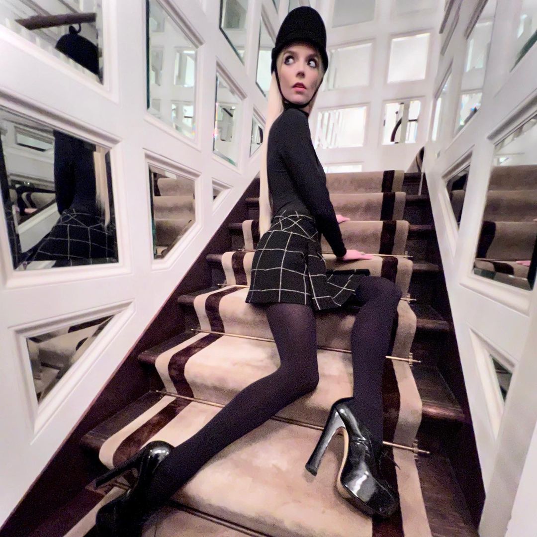 除了 Harris Reed,Anya Taylor-Joy 以多款來自洛杉磯二手衣商店 Aralda Vintage 的復古珍品打造今次倫敦宣傳之旅不同造型,包括她出席記者會那來自 Alaïa 1991年春季系列的 Tati 千鳥格背心迷你裙及套裝,配上黑白紋太陽眼鏡,帶來優雅又俏皮的造型。