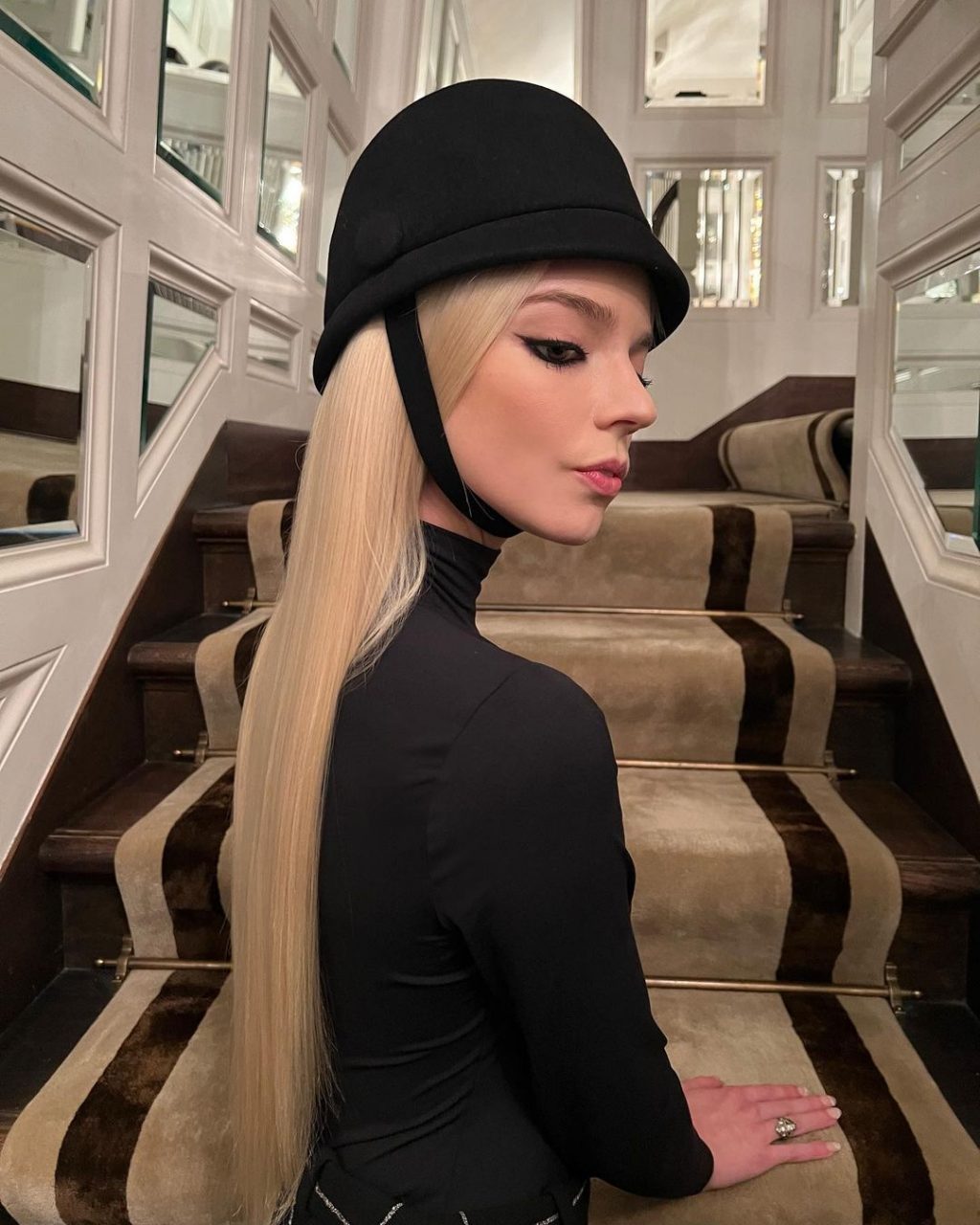 還有更多?她在 Instagram 上又分享了一套她穿上 Balenciaga 迷你裙及騎馬帽以及搭配 Vivienne Westwood 厚底高跟鞋的造型,一樣來自 Aralda Vintage。