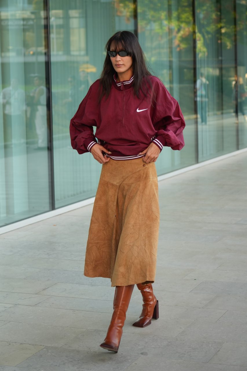 想要更有復古氣息的,不妨選擇一款麂皮半身裙。Bella Hadid 將它和復古運動衫配搭在一起,變成一個意想不到的組合。可見麂皮單品其實不限於風格,隨意混搭也有出乎意料的效果。