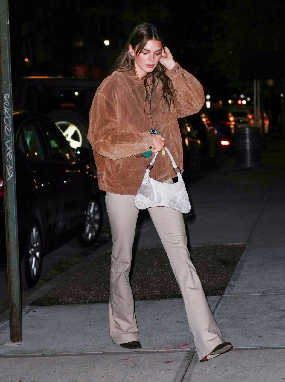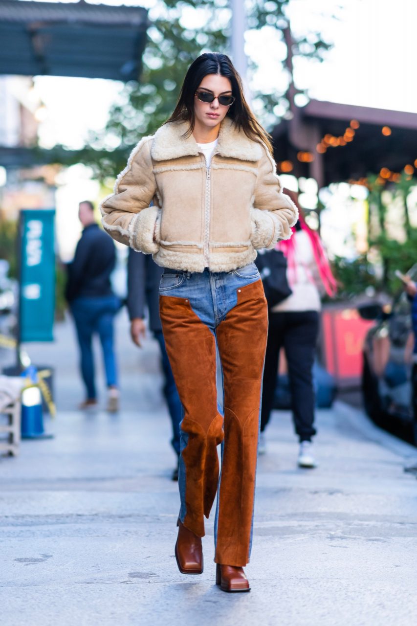 麂皮長褲同樣不是日常的感覺,未必是很多人首選,但其實穿起來是非常 Chic 的。Kendall Jenner 身上這款來自 Acne Studios 的牛仔布拼麂皮長褲,就讓人眼前一亮。不僅撞色還撞面料,材質、線條、形狀的有趣碰撞,時髦之餘也相當 Cosy。