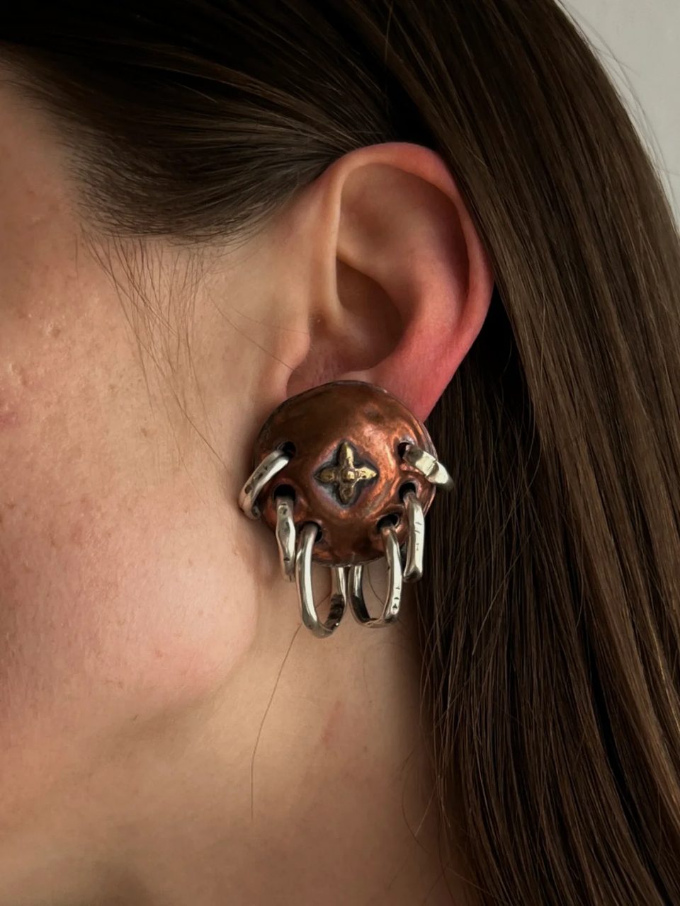 這款耳環採用熱處理銅製作而成,透過這種工藝,金屬的變化反映了身體傷痕的色調,在表面形成獨特的圖案,確保每只耳環都是獨一無二的。