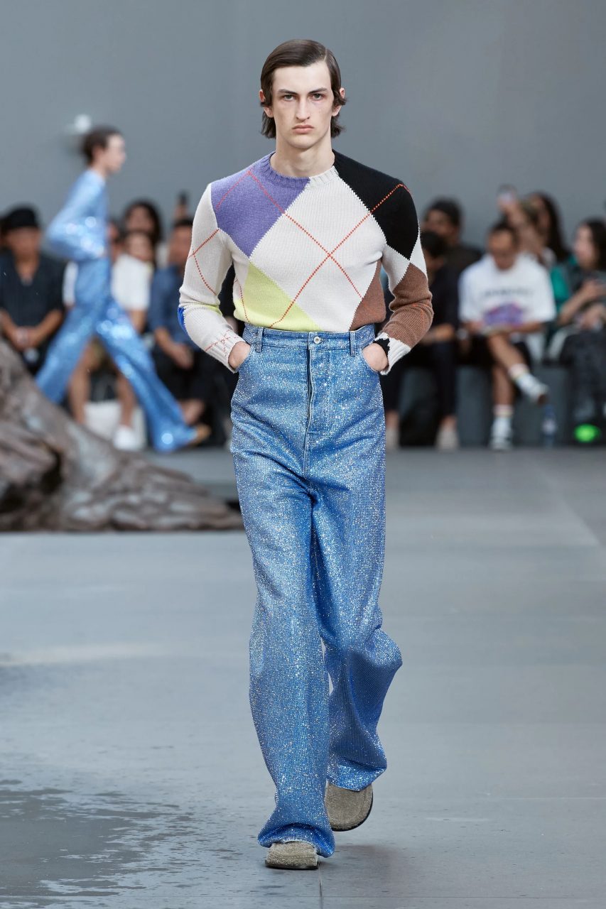 除了在表面印上圖案,也有品牌會透過特殊加工,賦予牛仔褲一個新定義,就像Loewe在牛仔布料上加上一層閃亮塗層,讓模特兒走路時,牛仔褲會隨著觀想照射的不同角度閃爍著光芒,本來平凡的寬鬆牛仔褲就這樣瞬間昇華到另一個層次,相當優雅。