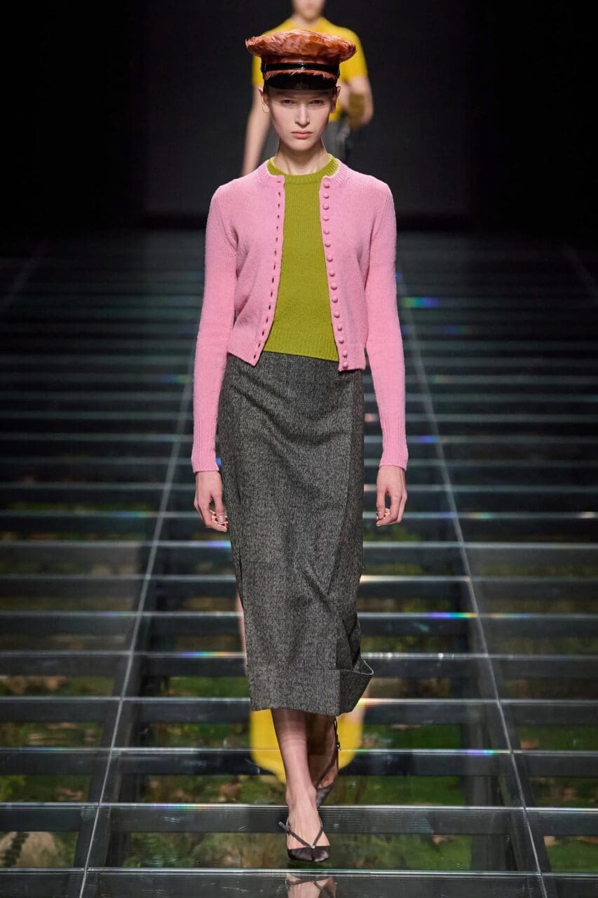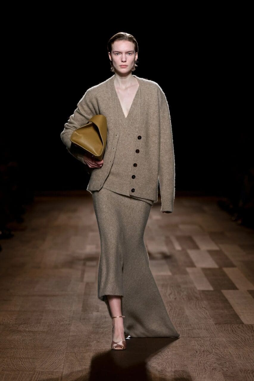 在 Chloé,羅紋針織服飾搭配腰帶而得到提升,這是一種巧妙的方式,可以減輕超大毛衣或針織連身裙的臃腫感,打造更時尚的輪廓。Prada 也推出了 Bree Van de Kamp 風格的開襟衫,採用顏色鮮豔的用色,以敞開方式穿在另一件針織衫上,營造出顏色對比鮮明的學院風格。如果覺得多種顏色的層次搭配在造型上太過誇張,那麼最簡單的方法就是堅持單一顏色,就像 Ferragamo 所見,兩件套裝的概念演變成針織裙、毛衣和開襟衫三件套,全部採用美麗的燕麥色色調。