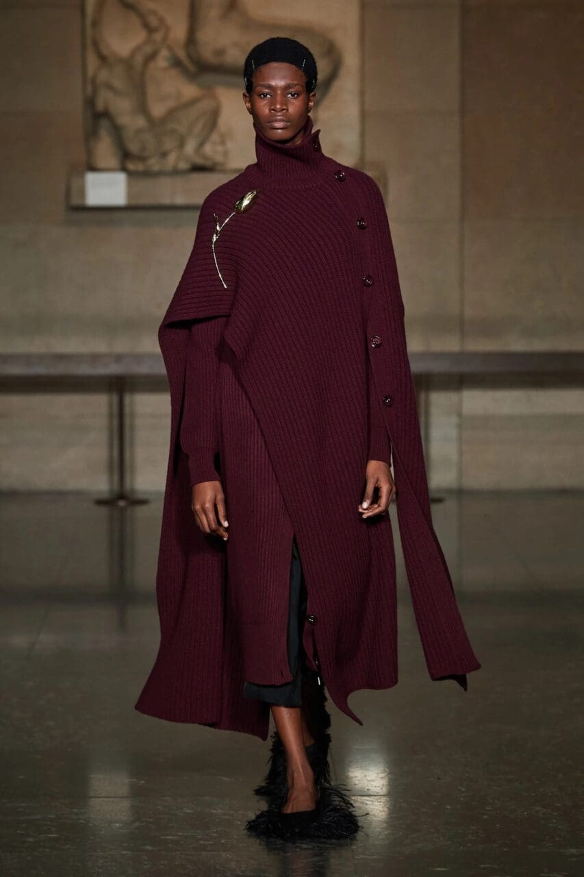 這個特別的造型技巧在今年九月風靡前排,但這並不是今秋提升冷衫的唯一方法。超大圍巾、披風和雙層針織衫,繼續延續了「垂褶」的主題——沒有什麼比披上大量的馬海毛、羊毛和羊絨更迷人(或昂貴)的了。內附圍巾 (scrumpers?) 的毛衣的興起,讓這種「大人的襁褓」更容易於實現。還有什麼比身後跟著一串羊絨線更美妙呢?