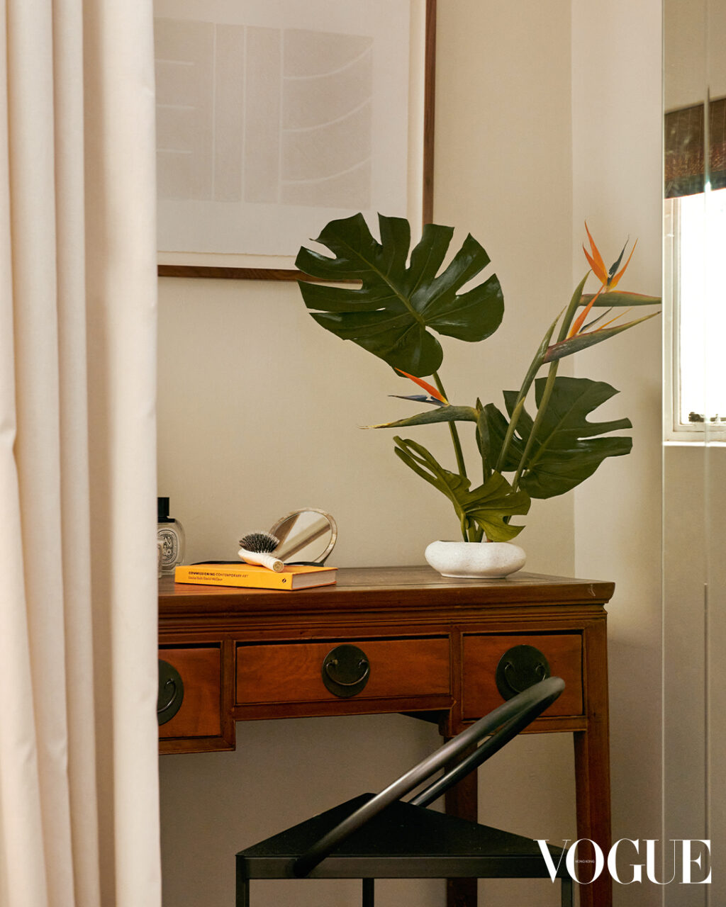 In the living room, a wall plastered with art anchors the space. The collection includes works by Reuben Beren James, Jake Chapman, Damien Hirst, Tracey Emin, Muhannad Shono, and Austin Lee. “Damian’s years at art school were fertile ground for trading early works, and we’ve been buying sporadically ever since,” Bridgland explains. “The most recent addition is a Kim Lim work on paper that hangs calmly above my dressing table. Every piece in our home feels like part of an ongoing conversation, one that reflects where we’ve been and where we’re going.”