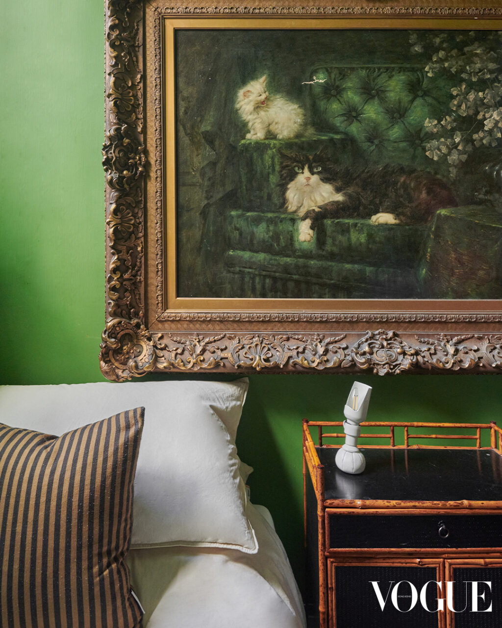 One room that perfectly captures this spirit is what the couple affectionately dubs “The Green Room”. Painted entirely in a vivid shade of green, it’s perhaps the most whimsical and unexpected space in the house. On the wall hangs a painting by Austrian-American artist Carl Kahler, A Tuxedo Cat and a White Kitten on a Green Sofa (before 1906), overflowing with character and charm.