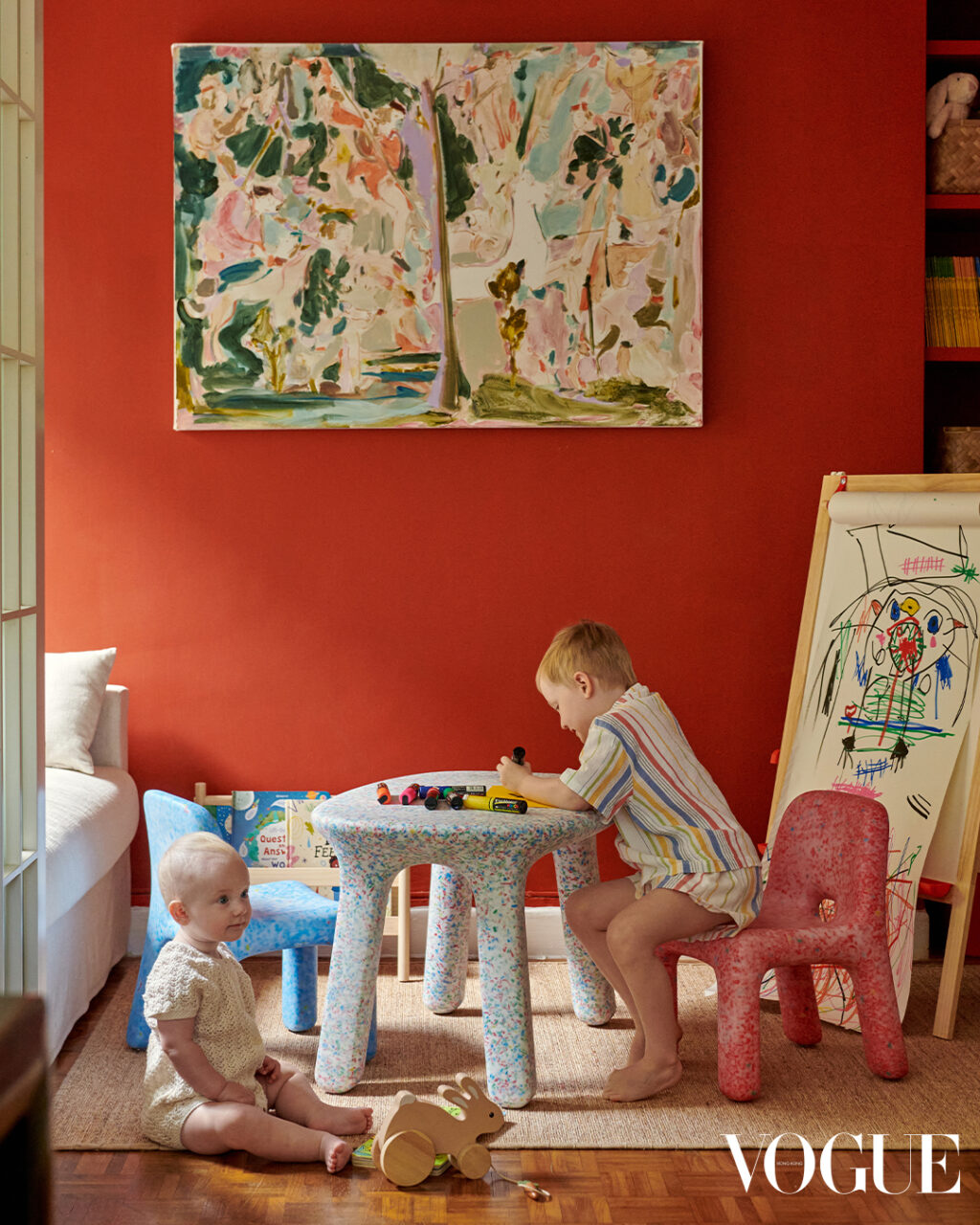Caspian and Sterling in the playroom. A Vitra Akari ceiling light and ecoBirdy table and chairs are paired with a painting by Tomo Campbell on the wall