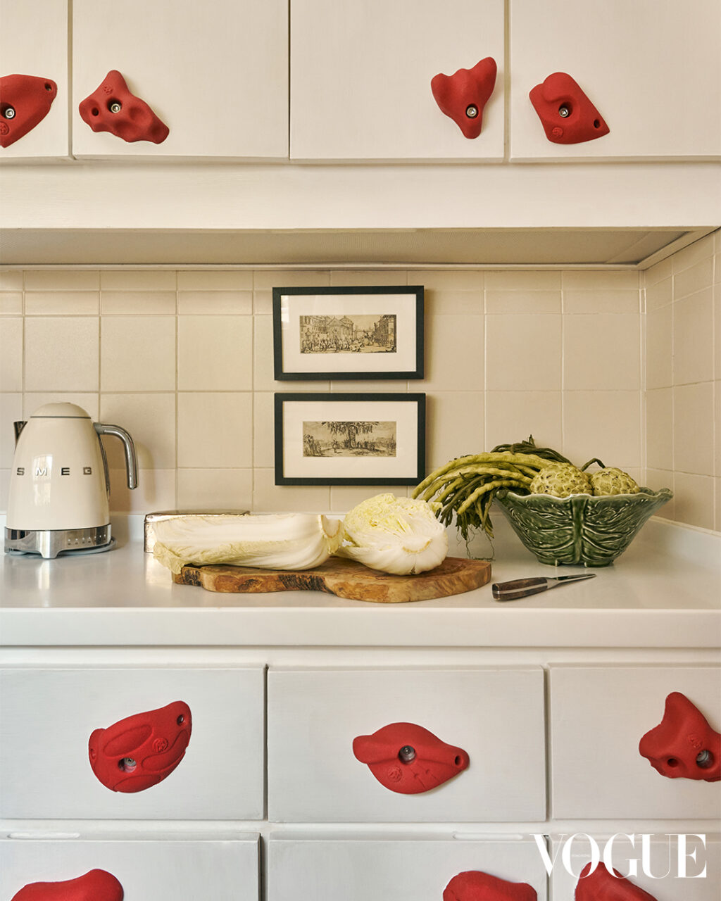 Playful details weave throughout the home, turning the mundane into moments of delight. In the kitchen, climbing holds serve as cupboard handles. “We put the hardest grip on the snack drawer—maybe Caspian will grow up to be a free climber, anything for that sugar rush,” Bridgland jokes.