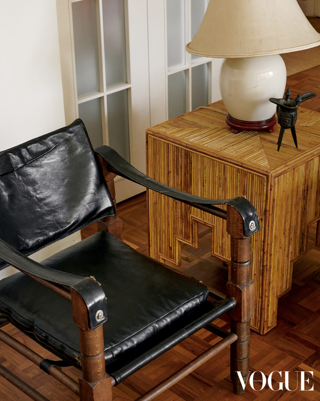 The Rowan side table from Permanent Resident complements the antique black leather safari chairs
