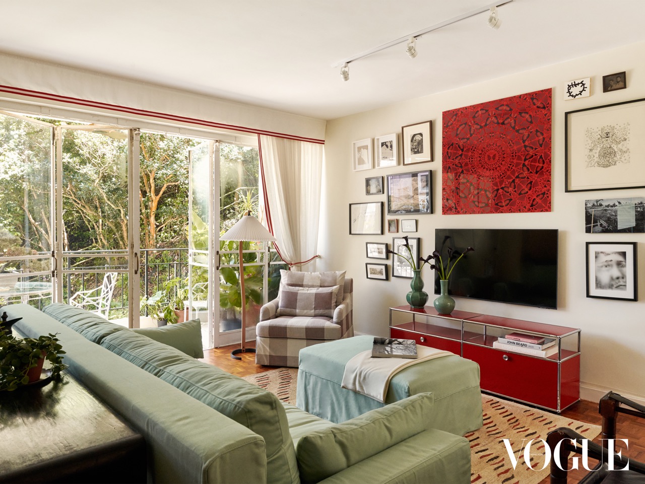 The design of their home is as eclectic and layered as the building itself. Upon entering the apartment, visitors are greeted by a corridor intentionally drenched in a deep green. The journey into the living room feels almost theatrical, where the moody corridor gives way to a space bathed in natural light—a contrast so striking it is almost poetic.