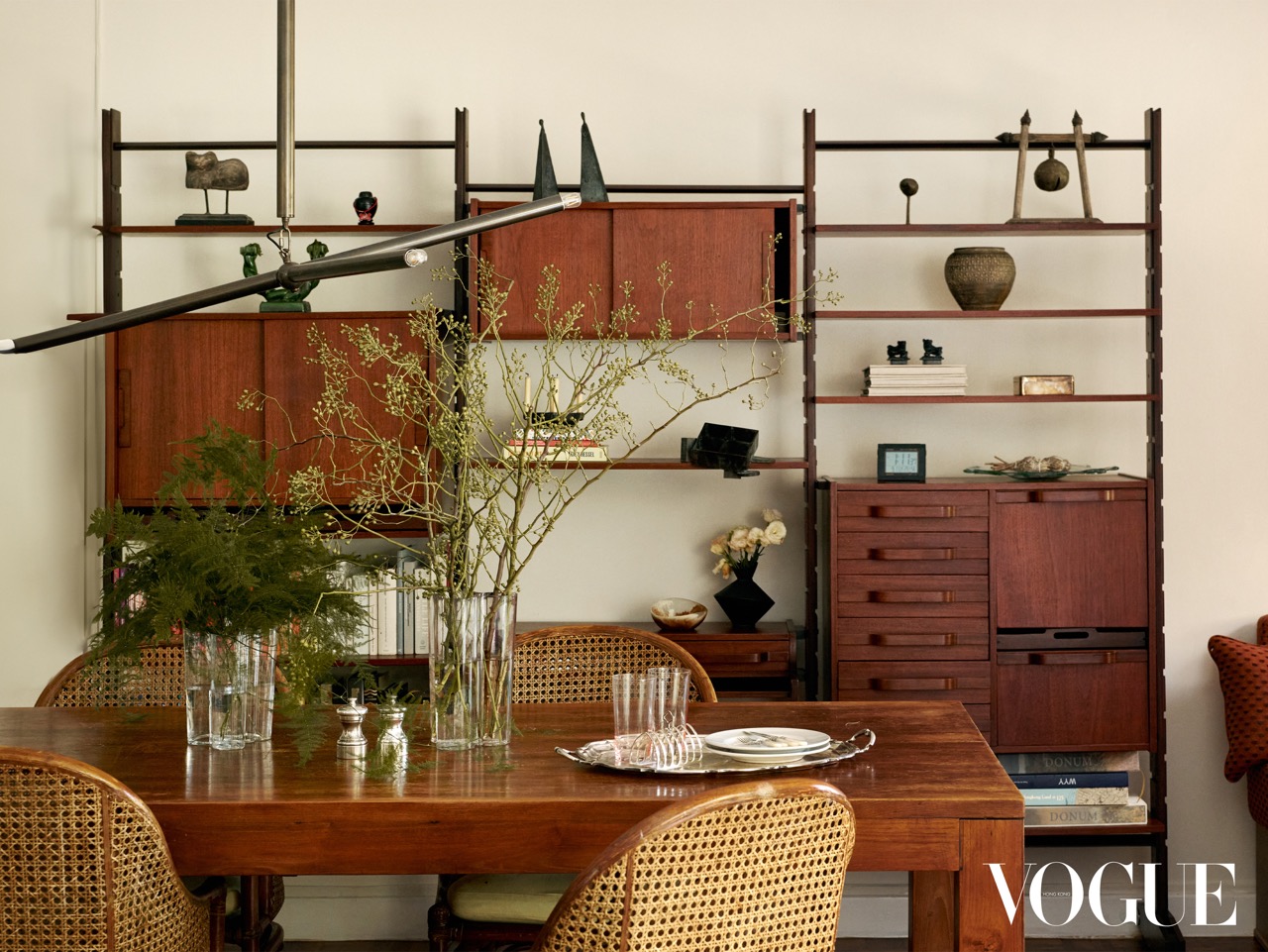Along the wall stands an antique shelving unit by Ico Parisi, with Damian’s family heirloom silverware and vases by Alvar Aalto displayed on the table