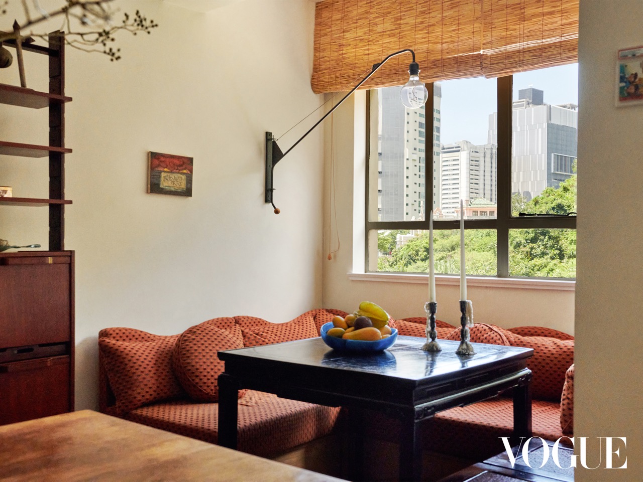 This celebration of joy continues in another corner of their home, a small alcove affectionately called “the naughty corner”, where the children are not allowed to enter. “The apartment layout gave us this odd alcove—not quite big enough for dining, and too close to the living room to function as a study—so naturally, it became the spot where we imbibe,” Bridgland shares.