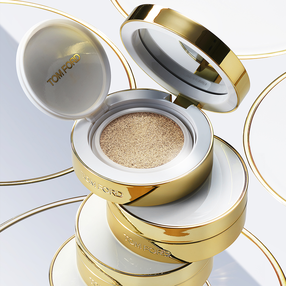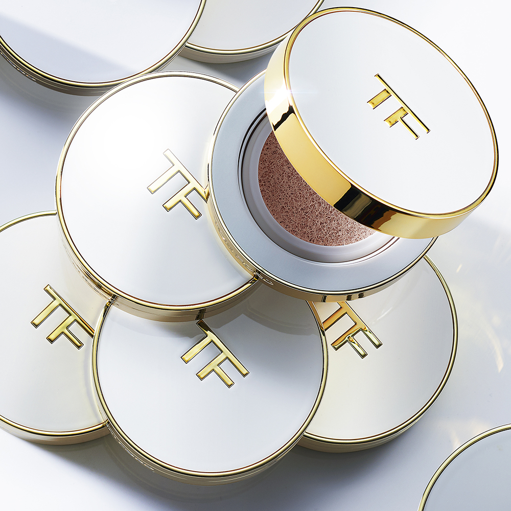 彩妝師率先使用了最新推出TomFord Soleil 柔光水瀅白氣墊粉餅 SPF 40/PA++++,為兩大超模打造完美光澤的天使肌。氣墊粉餅具珍珠白瓷肌極緻珍珠光分子,令妝容極具水盈效果,也令肌膚更光澤、健康及明亮,而且它含Tom Ford Infusing Complex護膚成分,其保濕效果為皮膚帶來清新冰涼感受。在天橋上,模特兒與台下觀眾極接近,如底妝厚重、膚色暗沉,必定令人驟然失色。氣墊粉餅具輕薄自然的覆蓋力使膚色更均勻,並隱沒瑕疵。同時它具備智慧校色功能,能即時修正膚色暗沉與泛黃問題,令輪廓變得立體、細緻。出場前一刻,只需一分鐘就能瞬間抹去瑕疵,塑造完美上鏡、具光澤感的底妝,令模特兒的皮膚在鎂光燈下保持完美無瑕,無論任何時刻都成為台上的焦點,是化妝箱裏不可缺少的美妝產品。