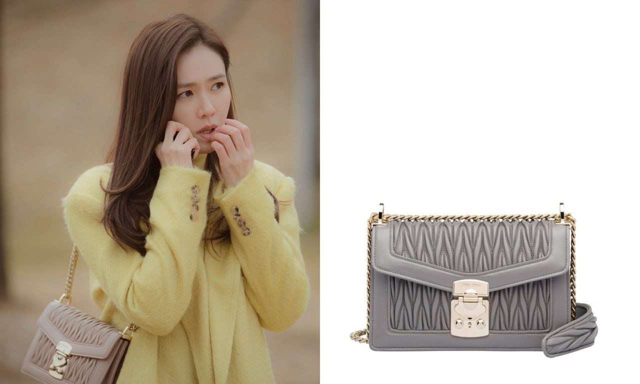 第15集中,在國家保衛局的調查影片中,尹世理赴約時,穿著一身柔美的鵝黃色大衣,背著MIU MIU的經典Miu Confidential Matelassé皮革包,這款有著金屬印字標誌、風琴式隔層的包款,辨識度高且好裝,當成日用包也很適合。