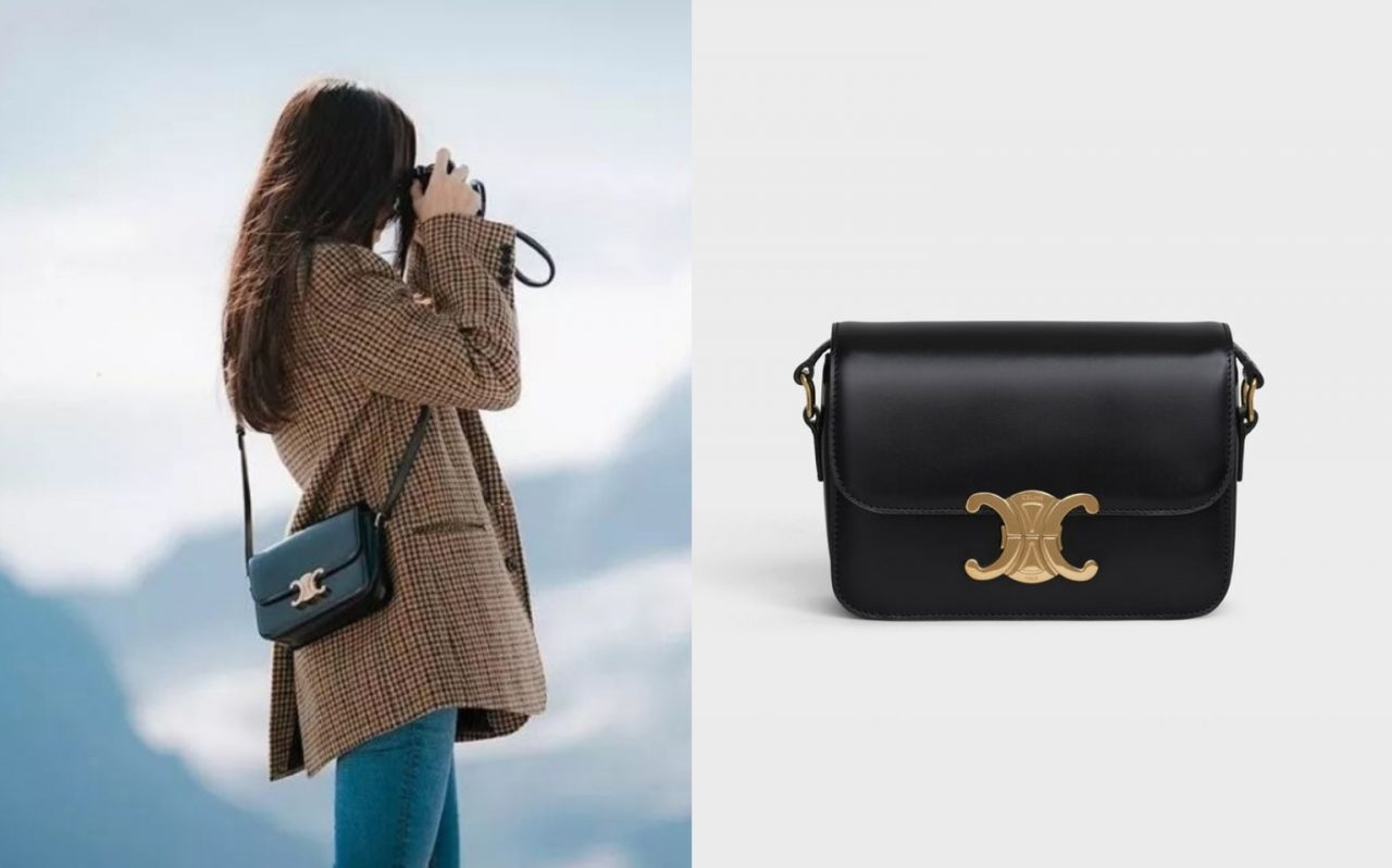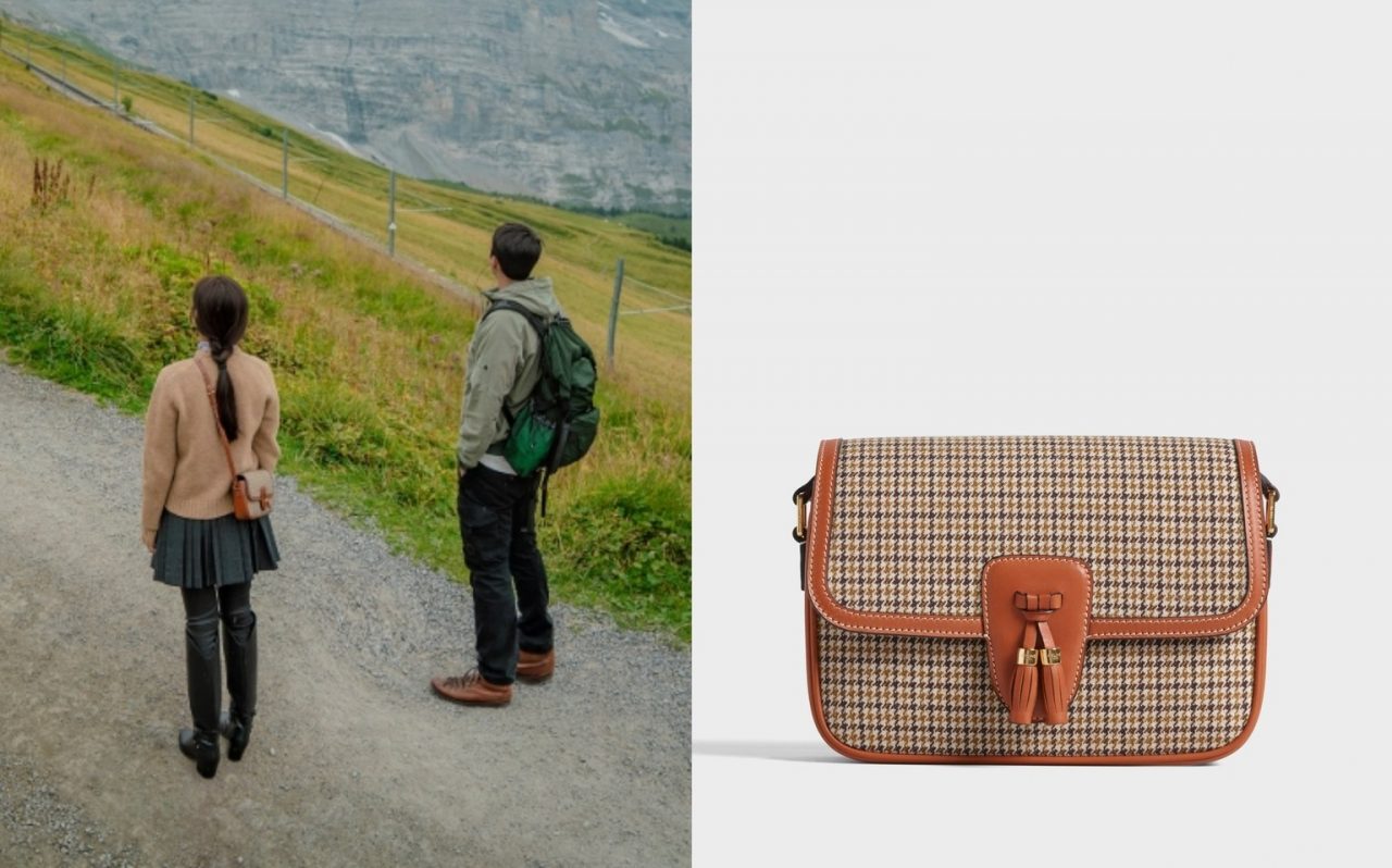 孫藝珍在劇中身穿多套CELINE服飾,其中背的一款是被譽為女神IT美包的TRIOMPHE黑色包款,融入方正輪廓和背對背雙C金屬扣鎖,另外一款則是搭配格紋TASSEL方包展現溫柔女孩質感,活潑中帶些學生氣息。