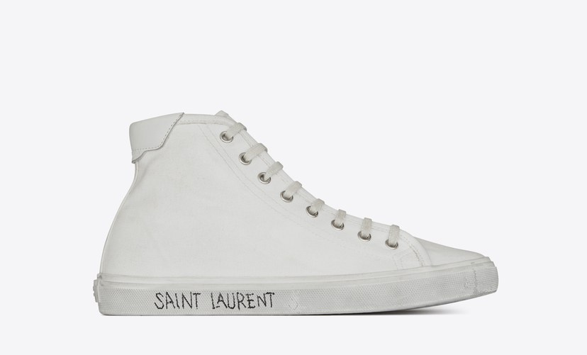 根據本年度明星款式“ Malibu”的名字來判斷,本季 Saint Laurent 的名單上有棕櫚樹、陽光和海洋空氣。 詳細信息:半高皮革和白色帆布運動鞋,也有低筒版本。 低繫帶Malibu運動鞋由帆布製成,有三種款式:黑色,白色和豹紋。 鞋底上印有“ Saint Laurent”字樣,每種款式都印在後舌上。