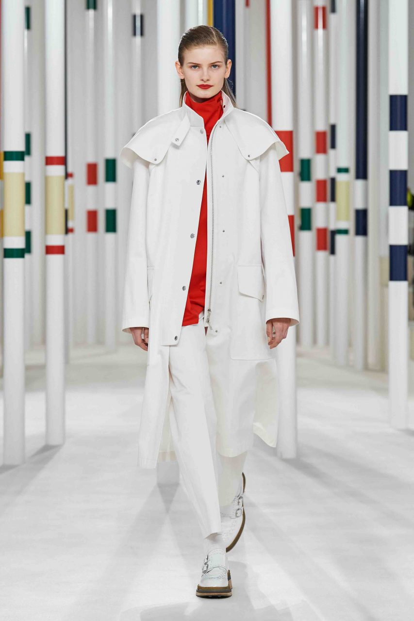 場地的三色裝飾,與衣物的簡約主義配合得非常有趣,80年代的現代主義時裝設計師Jean-Charles de Castelbajac啟發了Vanhee-Cybulsk為Hermès注入一種樂觀態度。這位愛馬仕女裝設舵手始終認為:美麗必須有用——這是她在德國包豪斯學回來的,剝去事物表層以,功能同樣重要。這就是這奢華品牌一直以來平衡美感和實用的心法。