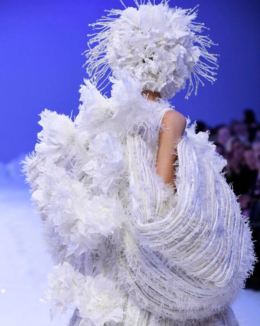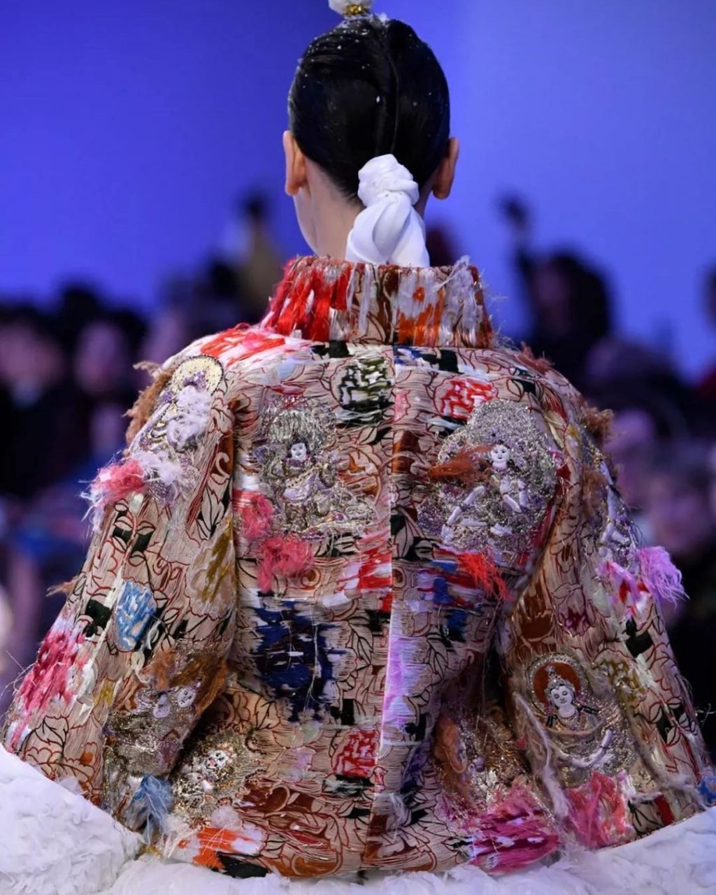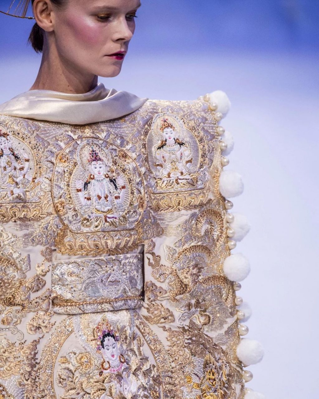 這一季的主題是喜馬拉雅,代表每個人心目中的高峰,她搜尋到日本200年前的和服腰帶、中國雲錦和意大利面料。有趣的是,只用這些面料的反面,那些做成緹花的線象徵文化的絲絲縷縷,在今天找到既有過去還有明天的平衡,是值得思考的議題。「我想高訂應當帶來一個行業的思考,接近於藝術,更注重表達而不應該是商業。創造行業的記憶,也許是手工、形、色彩。找尋到一個新的今天,或許才是高訂的意義。」