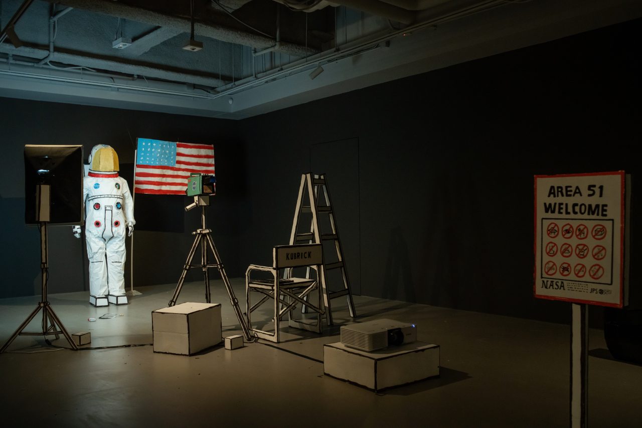 JPS Gallery kicks off their 10th anniversary celebration with Moon Lands On Man, an immersive exhibition by American artist Barminski. Known for his playful sculpture artworks that are crafted from paper-based material, Barminski transforms the gallery space with his chosen medium, constructing three different sets from cardboard. Designed to take its audience from a nostalgic toy store filled with familiar galactic figurines to a filming studio disguised as the control room of the Apollo 11 spaceship, the exhibition is a humorous approach to the moon landing. With this universal event as its focus, one that is just as polarising as it is historic, Barminski explores notions of fiction, reality and expectation, encouraging audiences to live in pursuit of the truth.