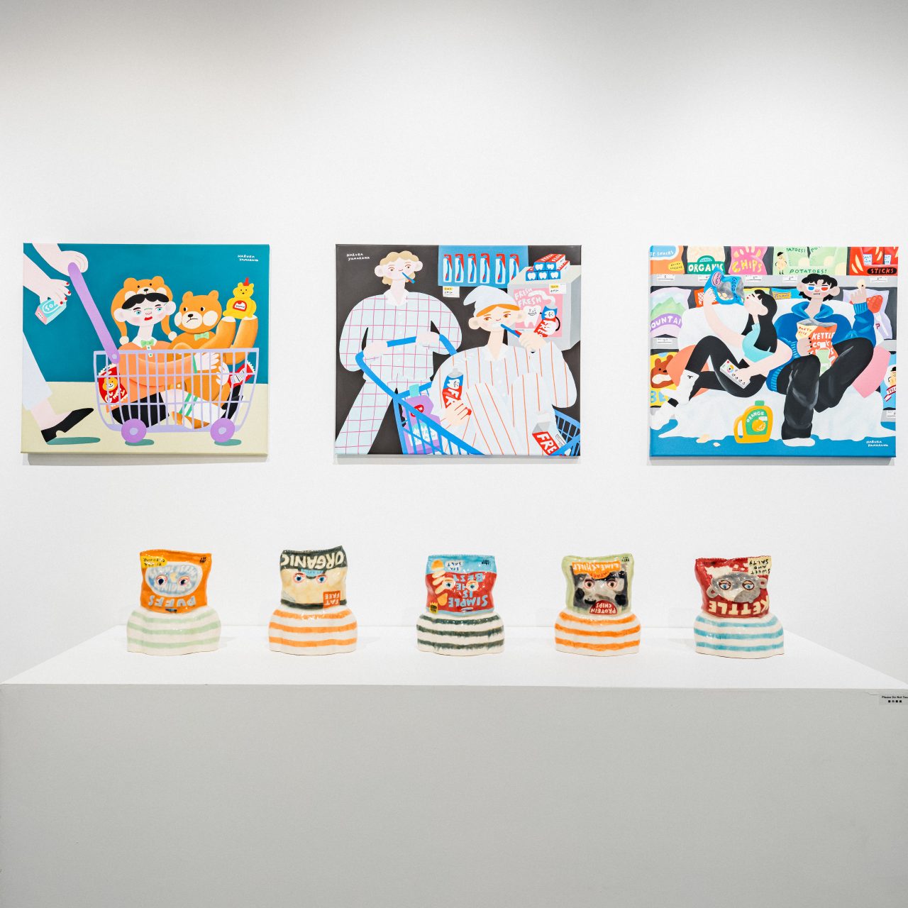 Haruka Yamakawa’s solo exhibition with Quiet Gallery is a reminder to romanticise our lives — especially the mundane parts. In Super Super Market Vol. 3, Yamakawa takes inspiration from the revitalising impact of casual trips to the supermarket during the Covid-19 pandemic. A new series of imaginative and highly saturated paintings depict a diverse world of fun-loving characters; friends camp out for a 3D movie at the chips aisle (Yamakawa’s favourite supermarket section), strangers find love at the checkout counter, and a jubilant pig mans the meat stall. Primarily an illustrator, Yamakawa also displays a penchant—and talent— for pottery. The exhibition also displays a limited collection of sculptures where glazed ceramic busts wear snack bags as balaclavas.