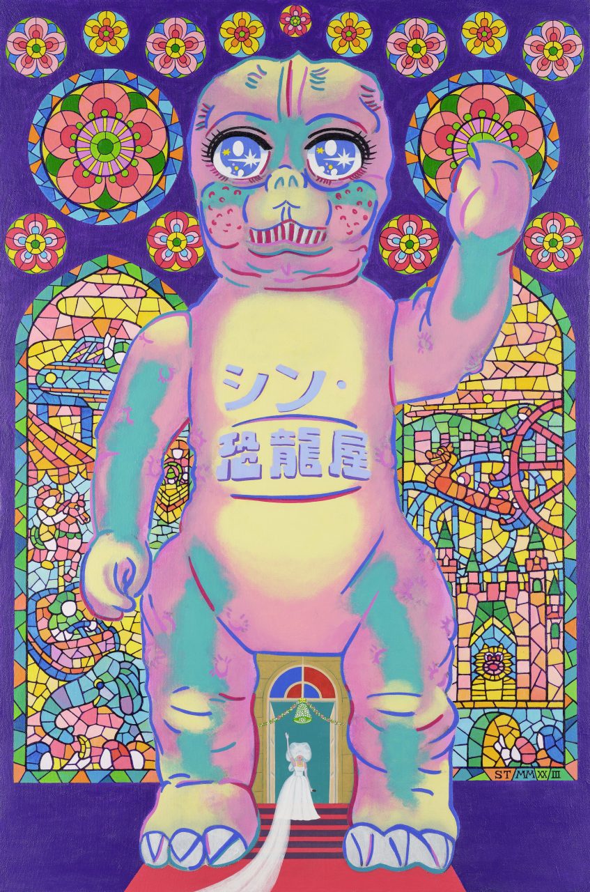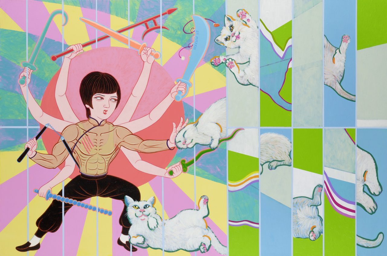 Hong Kong artists Wilson Shieh and Tsim Yim On showcase their latest works in a new exhibition with Bonhams, titled Trendi Club. Both born and raised in Hong Kong, the two artists take inspiration from the ever-changing pop culture landscape of our time, to forge colourful paintings as dynamic as their shared theme. Global K-pop stars Blackpink are transformed into modern gongbi-style goddesses under the delicate brushwork of Shieh, while Tsim pays a vibrant tribute to various icons of their generation including Boy George, Pelé and Cantopop singer Leon Lai. The exhibition also showcases three collaborative paintings by the artists, where the nostalgic Lai Yuen amusement park is revived in a playful rendition of its Dinosaur House in one piece, and where Bruce Lee faces off a hoard of cheeky white cats in another.