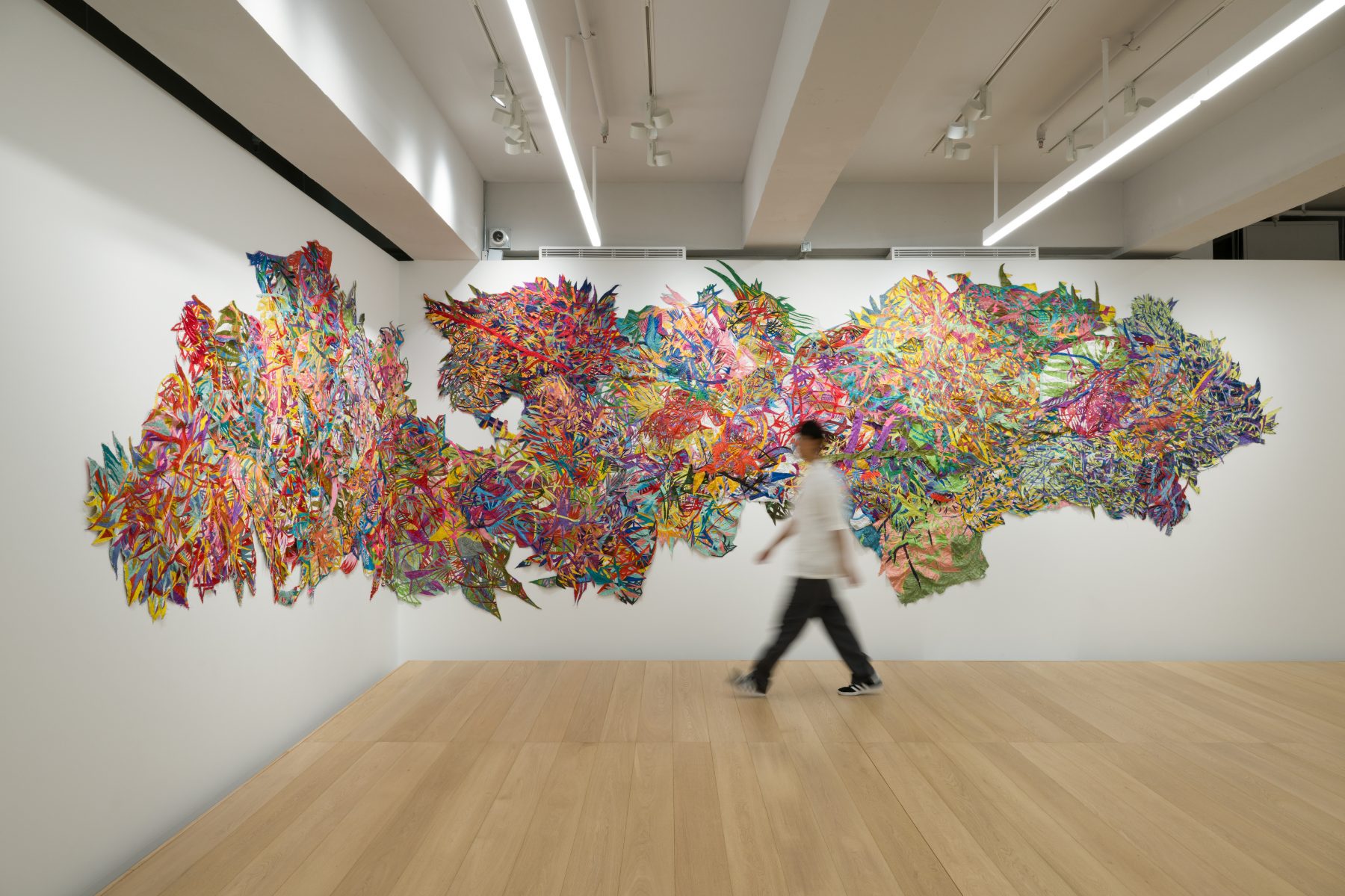 Japanese artist Ryo Matsuoka has long been recognised for his bold and unrestrained style, having lent his artistic talents to the likes of Louis Vuitton and JOYCE Hong Kong for their retail spaces, and even Yohji Yamamoto for a menswear collection back in 2004. Now he returns to the city for his second exhibition with WKM Gallery, Sky beyond words. At the gallery’s Wong Chuk Hang address, Matsuoka’s works inject life and colour into the otherwise naked space. Through a conjoined collection of nine embroidered textile works sprawled across two walls and a series of multi-sized linen canvases, the artist embarks on an abstract exploration of human emotions. Much like the explosive feelings of happiness, enthusiasm, and anxiety, Matsuoka’s pieces take on vastly unpredictable forms, producing layers upon layers of tactile colour for viewers to dissect.