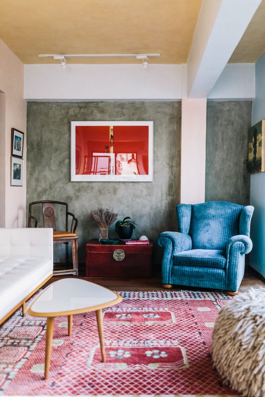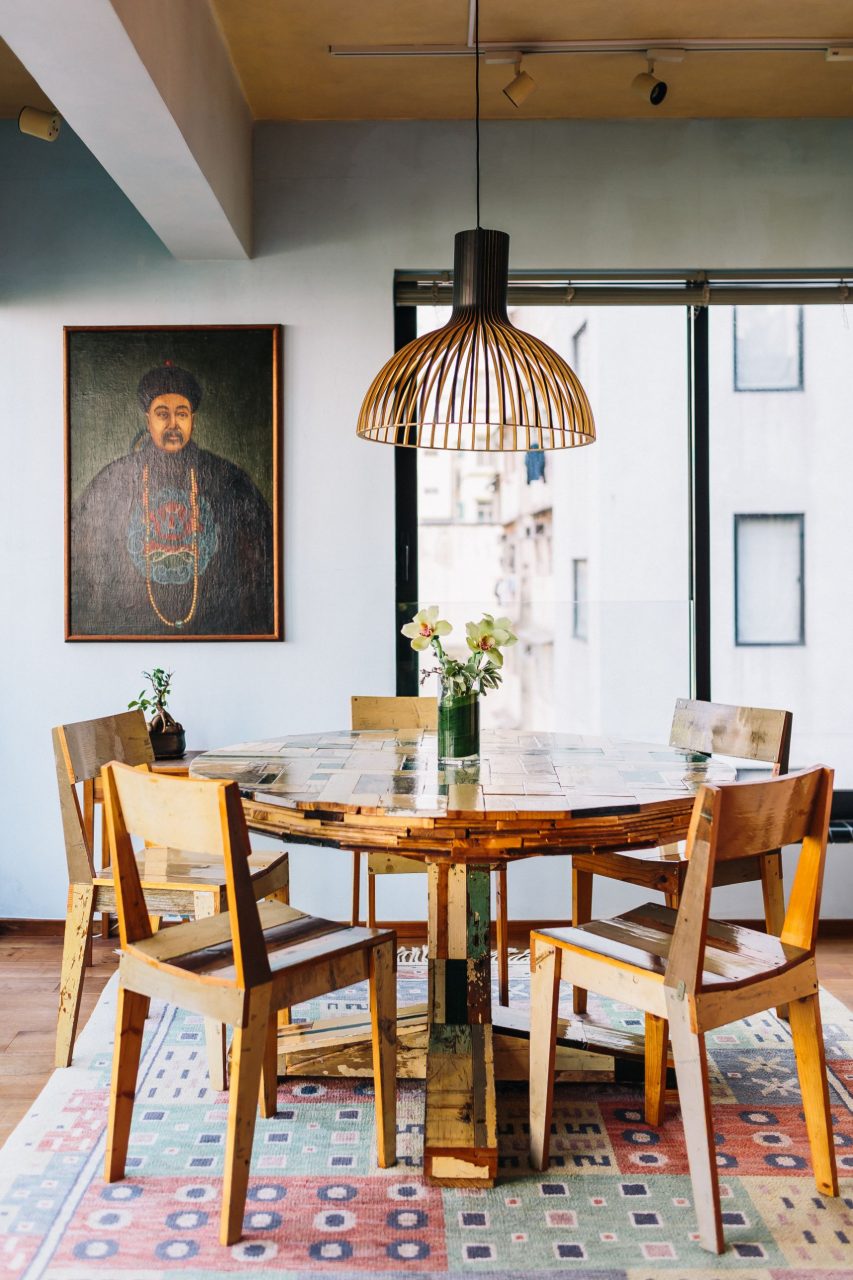 In the open-plan dining room and sitting room upstairs, a Piet Hein Eek lacquered driftwood dining table bought in London sits at one end, while a Danish sofa and red bowl chair by Finnish designer Eero Aarnio are at the other, the spaces divided by a glass Piet Hein Eek cabinet bought from Lane Crawford and filled with objects and curiosities. Hanging on the wall above the dining table is a painting of Barbara’s great-great-grandfather circa 1850 that was the only heirloom saved from her mother’s family home in eastern Nanjing during a Japanese invasion. It was passed to her uncle – the eldest in the family – and then onto her mother and, finally, to Barbara. A narrow outdoor terrace runs alongside the room, where beautiful old olive tree pots take pride of place, while a kitchen galley runs to the back of the building, where there’s a spare bedroom and bathroom.