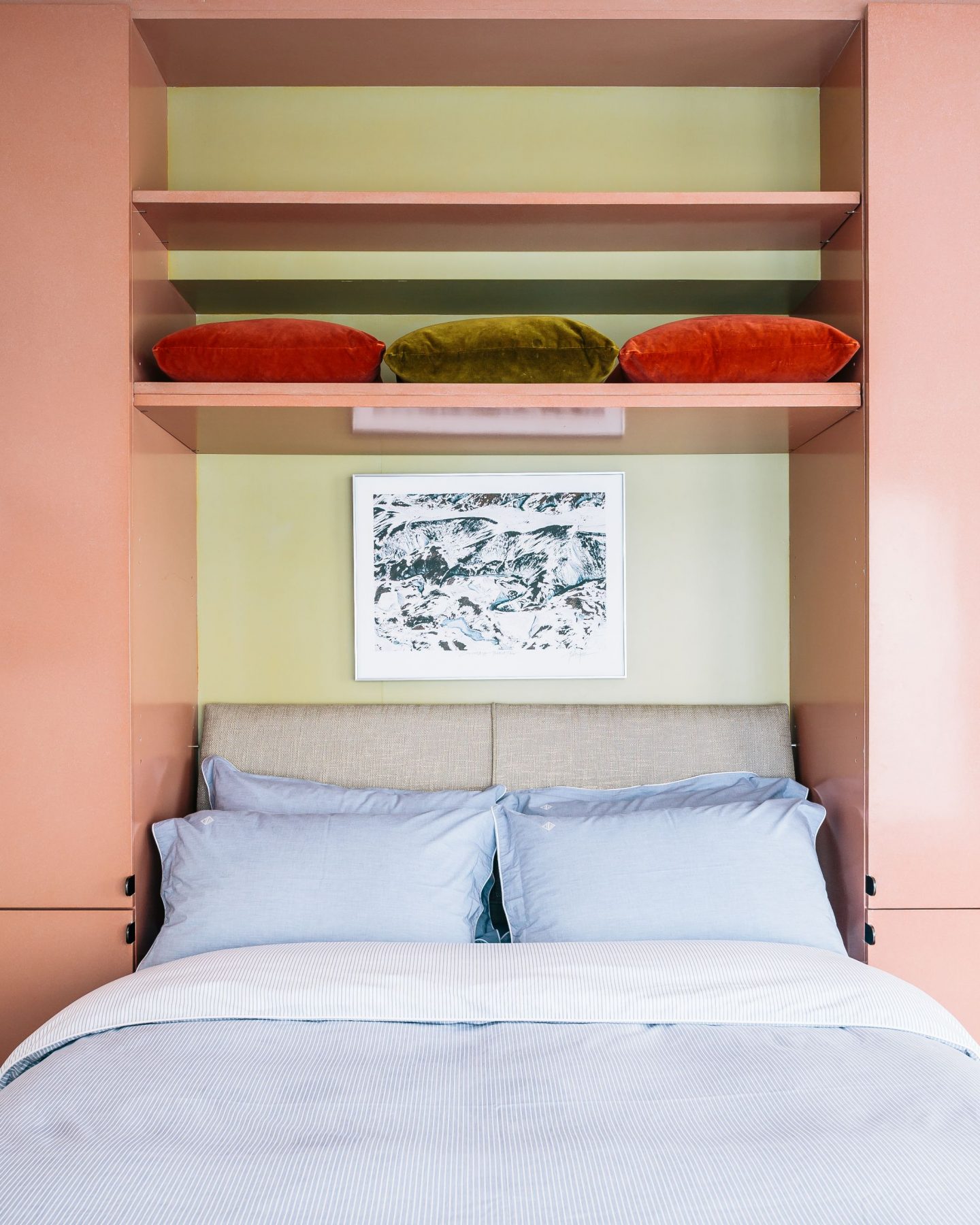 When Barbara and her Swedish husband of the time moved in and converted the two apartments to become one, the pair continued to add layers of warmth, decorating with wooden flooring, glass cabinets, mid-century antique Scandinavian furniture, family-heirloom artwork and colourful paints and fabrics, including in the original communal stairwell that is used to link the floors of Barbara’s home. “I have always been very much a colour person – I love strong colours, I love beautiful fabrics,” Barbara says. Throughout the home, the rooms are painted in block colours – each wall, ceiling or panel a complementary colour – but with an unobtrusive light, pastel appearance created through a Swedish painting technique whereby many very thin layers of paint are applied. Both upstairs and downstairs, large colourful rugs made in the north of Sweden add warmth underfoot.
