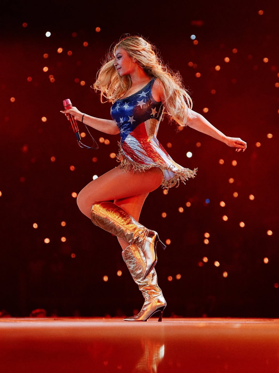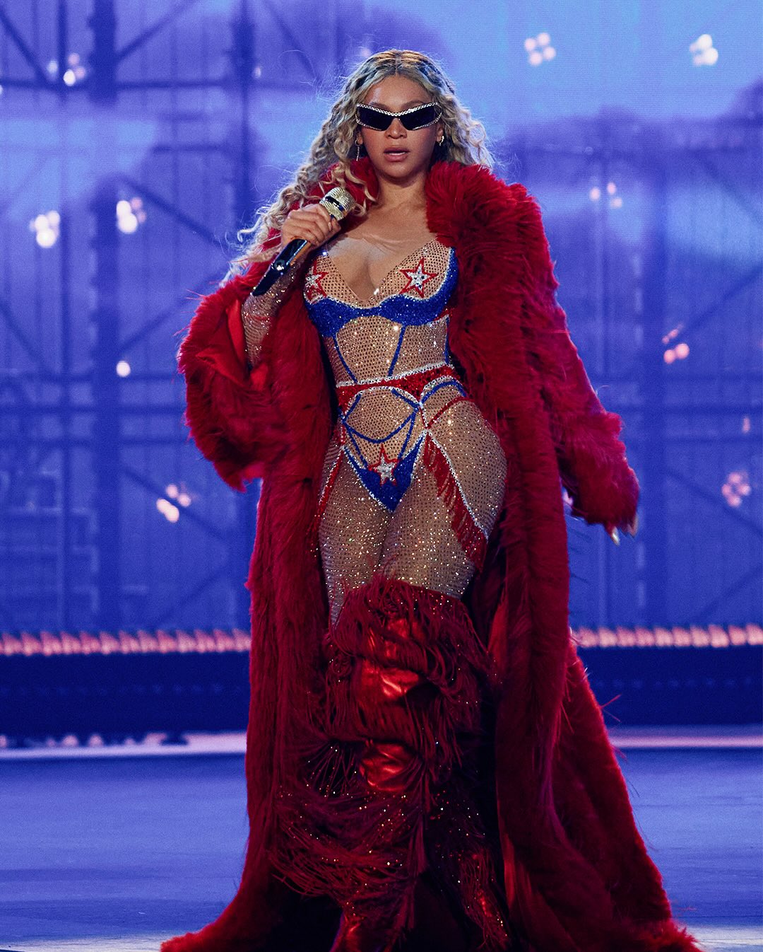 But Beyoncé didn’t stop there—she brought her patriotism overseas. At her London show, Burberry dressed her in a sparkling blue bodysuit paired with bedazzled American flag trousers, adorned with Swarovski crystal fringes.