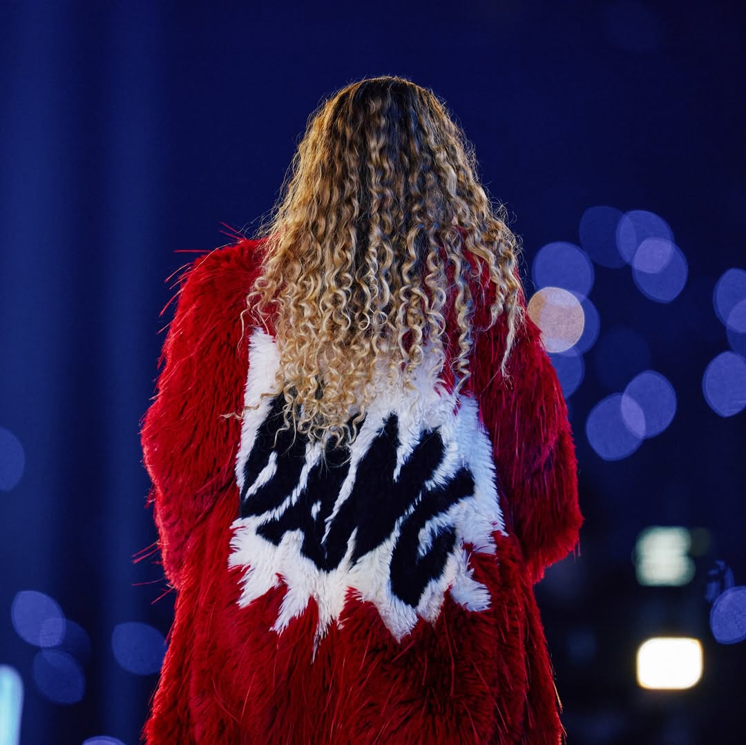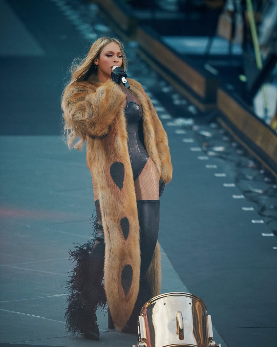 When Beyoncé wanted to dial up the drama, she added body-length coats to her already impeccable bodysuits. In London, Ferragamo dressed her in a black leather corset bodysuit and an intarsia shearling coat that was fit for a queen like Beyoncé. In another memorable coat moment, she wore a brown leather jacket from MM6 Maison Margiela with a faux fur coat from Cultnaked. Fan her off, she’s hot, hot, hot.