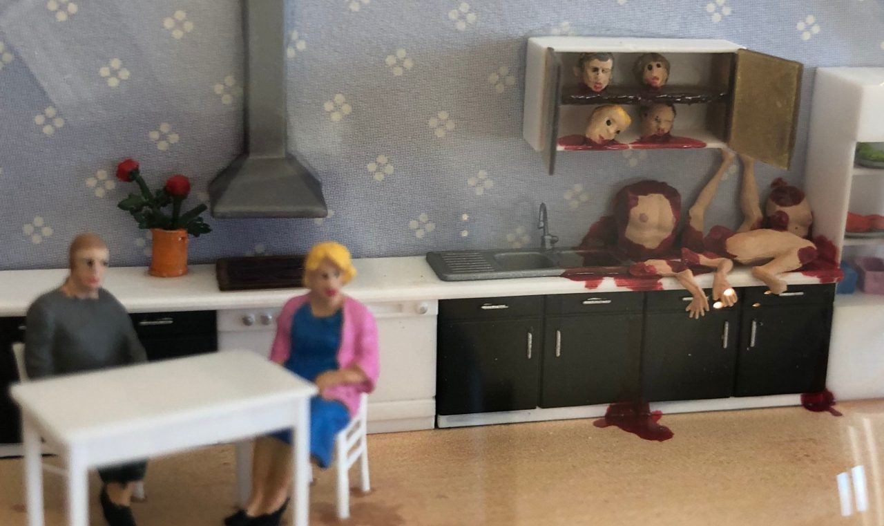 I have the pleasure of owning one of Abigail’s ‘dieoramas’ and I love to see people’s reactions to it as if it entices you into this false narrative of a “pleasant dollhouse”. As you peer into it, the familiarity is quickly altered. I love the fact that Abigail worked as a private investigator, so her fascination is beyond purely clinical depictions of violence, but a unique narrative lies in each of these grisly ‘dieoramas’.