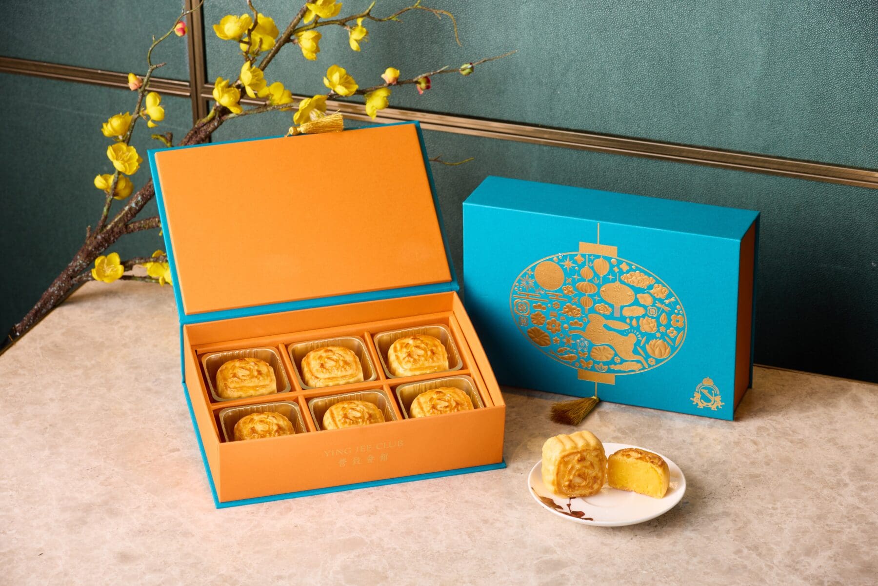 Visual spectacles meet gourmet delights with Yat Tung Heen’s all-new hand-woven bamboo mooncake gift sets. The sophisticated bamboo box is knotted with deep teal fabric, and the six delicate mini mooncakes ensconced within are equally photo-worthy. These come in a series of much-loved traditional flavours, including egg custard, white lotus seed paste, and red bean paste with mandarin peel.