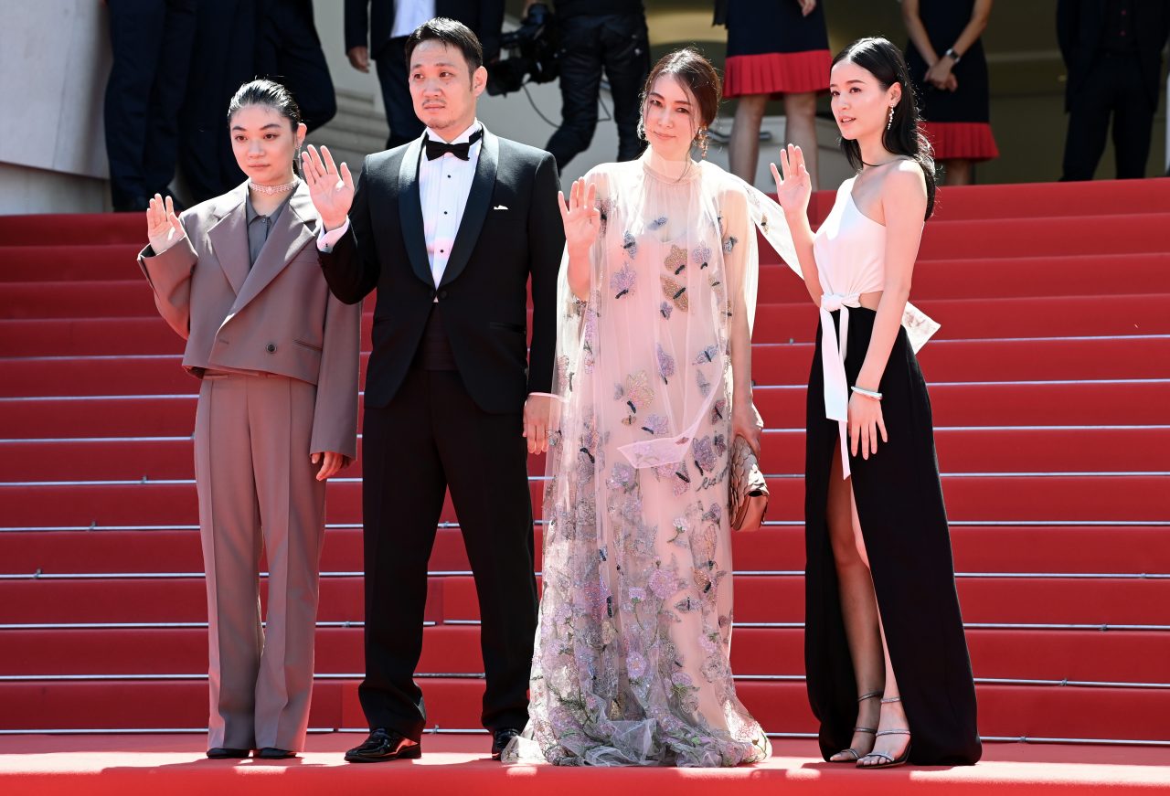 July 11, 2021 (L-R) Toko Miura, Reika Kirishima, director Ryusuke Hamaguchi and Sonia Yuan attend the "Drive My Car" screening during the 74th annual Cannes Film Festival in Cannes, France