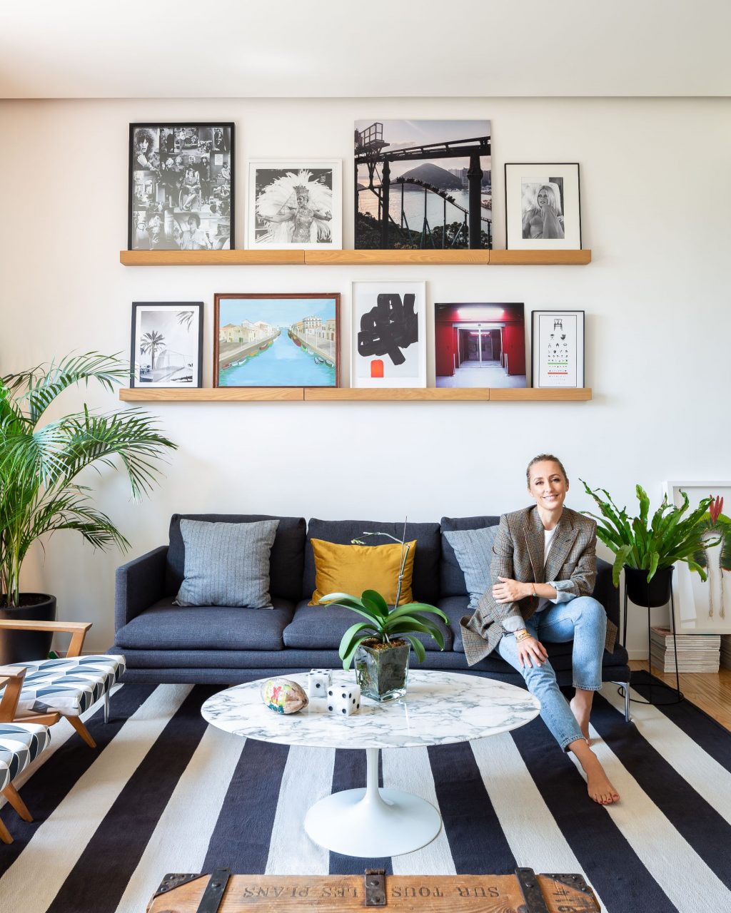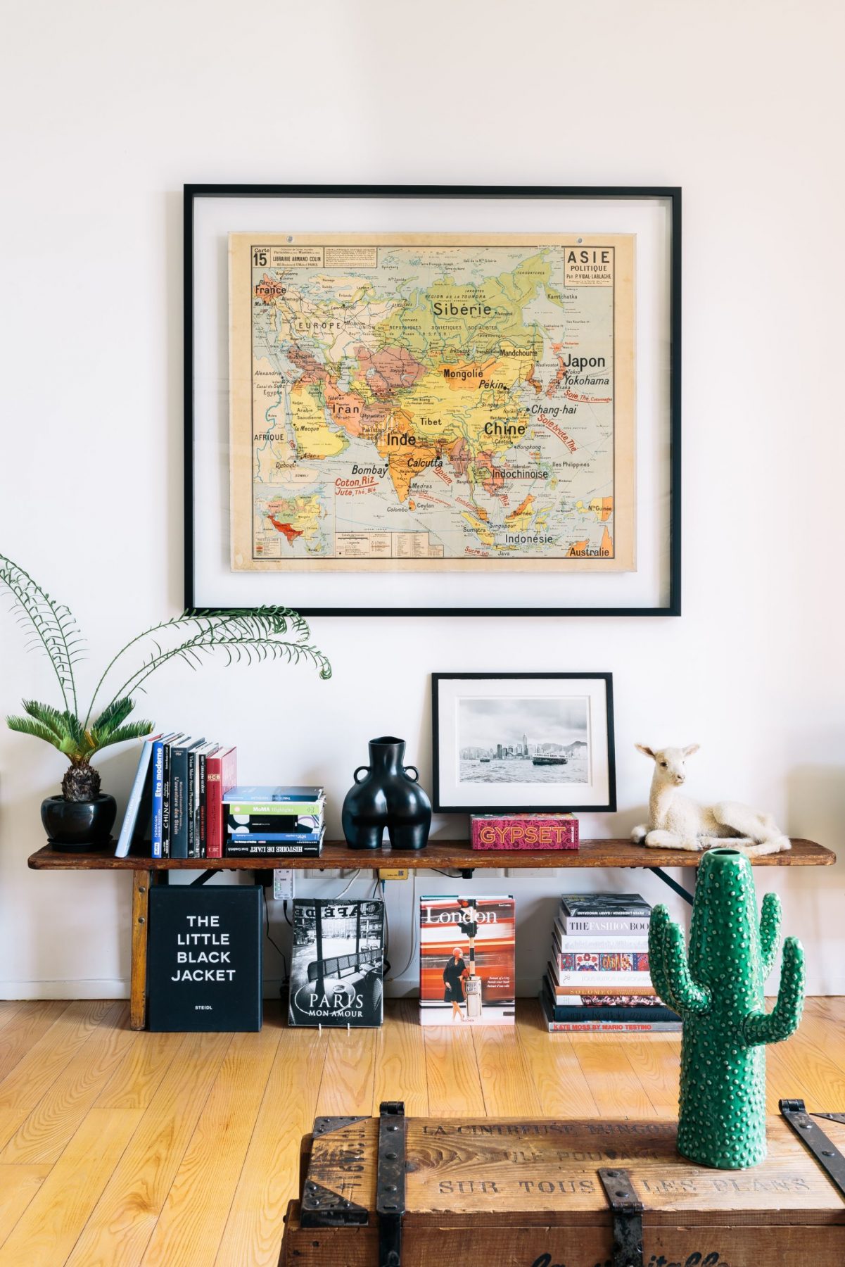 Downstairs, the ground floor has a nautical feel – in-keeping with the house’s seaside location – with fifties-print deck chairs salvaged from a flea market, a navy blue-and-white-striped rug, a vintage wooden chest, pots of shells collected by Fanny’s daughters, and an old map that Fanny sourced on eBay and that she felt was reminiscent of her school days. Shelves of framed pictures include one of an Ocean Park roller coaster by Alice Miquel. “It’s what my life looks like,” laughs Fanny.
