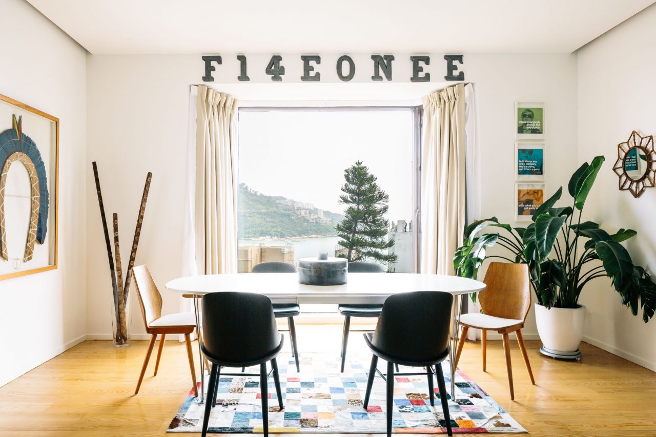 Upstairs is the kitchen, with its decorative Fornasetti plates, and many cook books for when time allows. Up again is the master bedroom, featuring artworks by André Cervera above the bed, and a limited-edition etching by Pierre Soulages, a favourite French artist of Fanny’s – “it’s about how you can produce light using just black paint,” she says of his work. In Fanny’s bedroom are two of her most recent acquisitions: a rattan chair from Tree in Ap Lei Chau; and a trinket table from Lumeun Home, a company set up by Fanny’s friend, who sources vintage furniture from China and creates bespoke pieces with an artisan in Hong Kong. Plants form a common thread throughout the house, all the way up to Fanny’s daughters bedrooms and the roof terrace above, reflecting the surrounding junglescape that reaches down to the sea dotted with sailboats and windsurfers below. “Weekends feel like a holiday here,” Fanny says of her new home.
