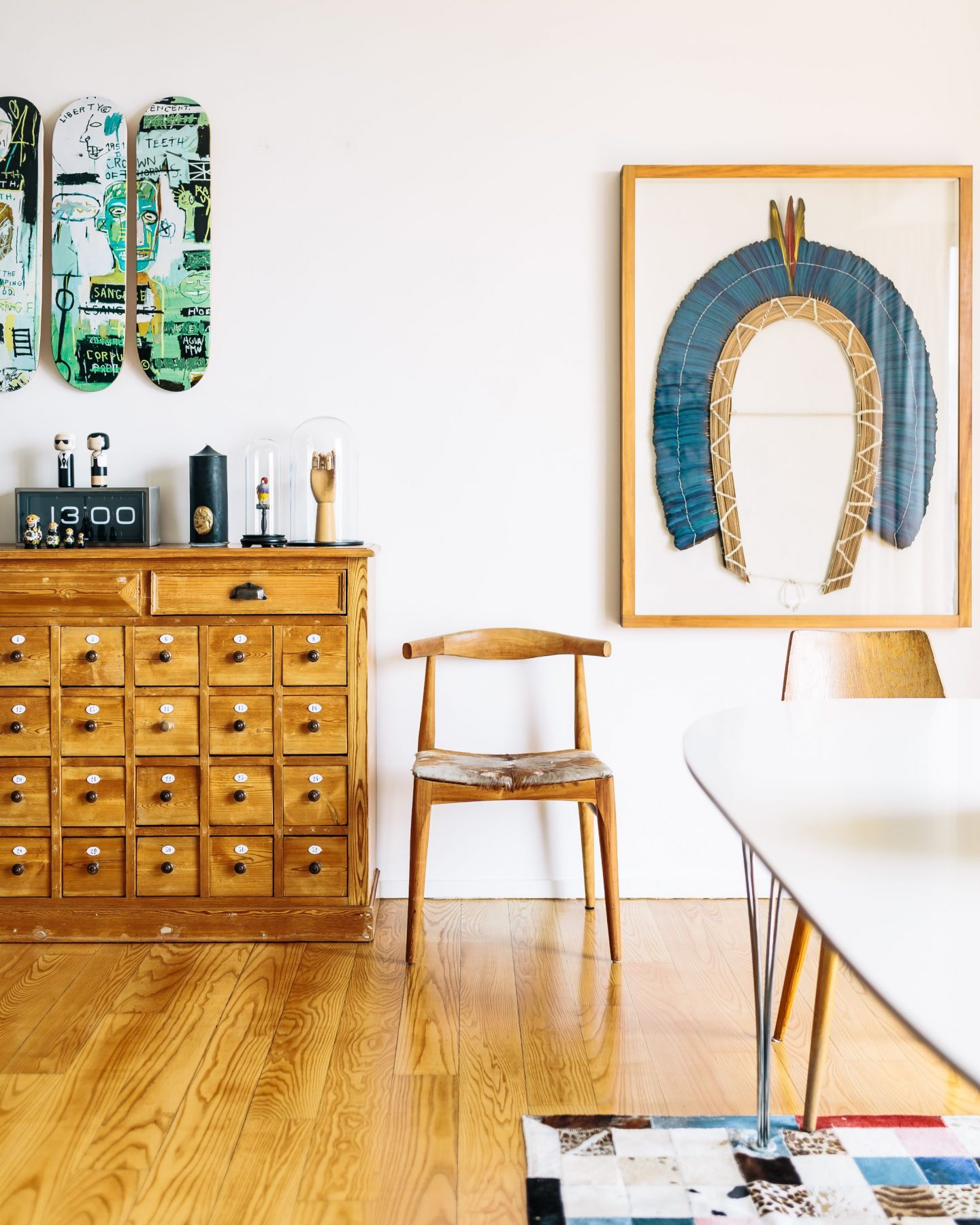 In the dining room, a framed feather crown hangs to the right of three Basquiat-print skateboards