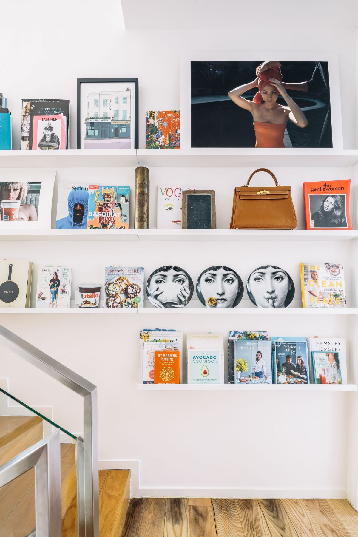 On the first floor, there’s the old barber chest foraged from her parents’ garage in France, and an assortment of sticks that were once planted in the sea for catching oysters and mussels. There are the mismatched mirrors found at a flea market that hang alongside a vintage poster of The Clash’s London Calling album – “I fell in love with The Clash when I moved to London,” Fanny says. On the opposite wall is a framed Amazonian tribe feather crown, brought back from a trip to Brazil, three Basquiat skateboards from Tate Modern gift shop, and a series of steel letters made by Fanny’s father. A compass from Fanny’s first trip to Hong Kong 20 years ago sits in one corner, and a pair of collectible Lanvin dolls from the Elbar Albaz era found on Vestiaire Collective stand to attention on a side table. A soft cream berber rug, a sofa plumped with Fornasetti cushions and a wicker armchair draped in a sheepskin hide add warmth to the space.