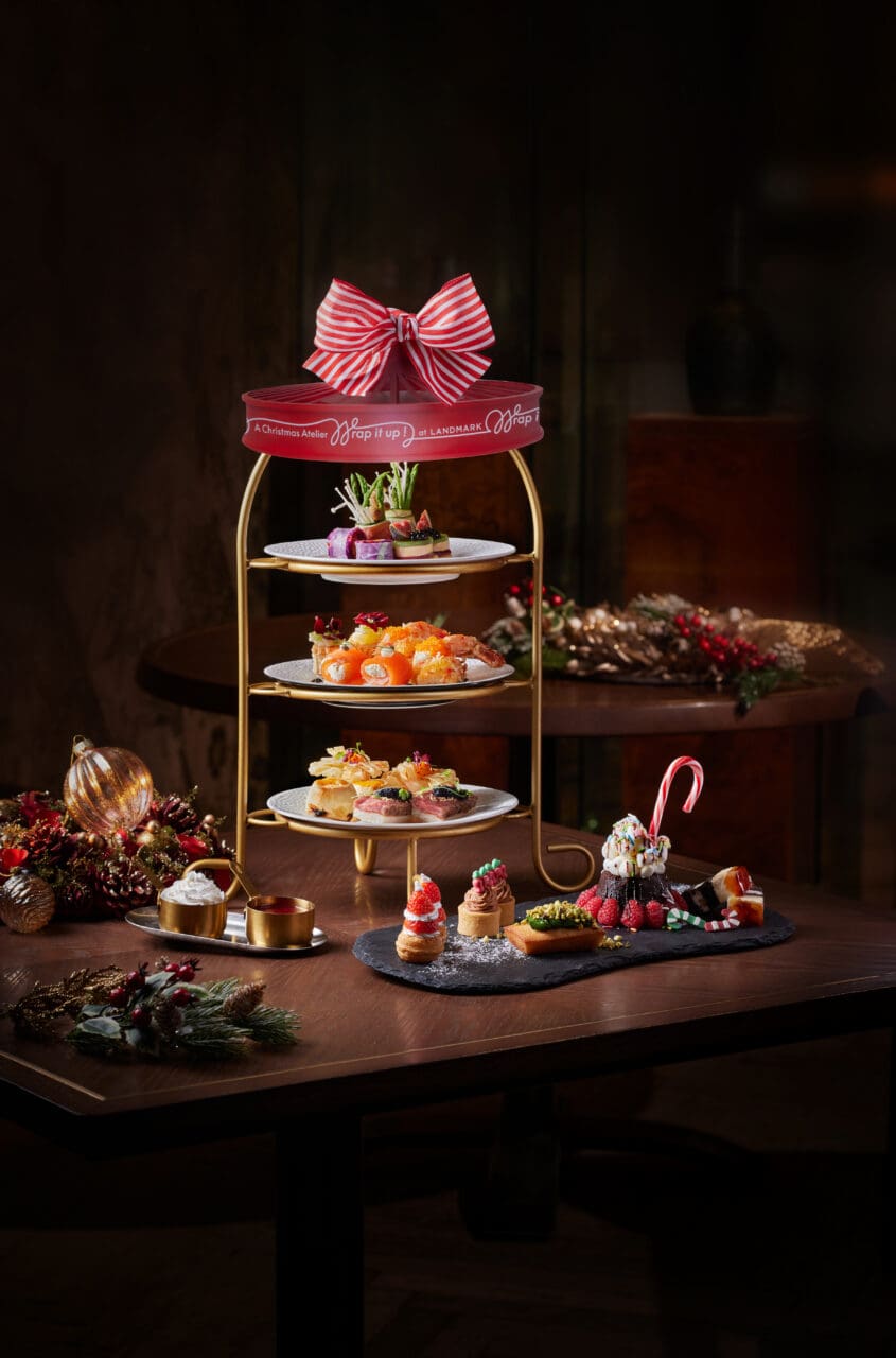 Christmas shopping may as well be a sport with all the steps you’re putting in going back and forth between stores! If you’re trying to set a new personal record at LANDMARK, stop by the Café Landmark for a well-deserved break or a delightful reward for all the hard work you’ve been doing. Coinciding with the Christmas Atelier at LANDMARK, the restaurant has whipped up a festive afternoon tea set brimming with holiday spirit. Treat yourself to savoury bites such as parma ham rolls and mini sesame wagyu beef sandos, sweets like bow-topped mont blanc tarts and a decadent molten chocolate cake pierced with candy cane.