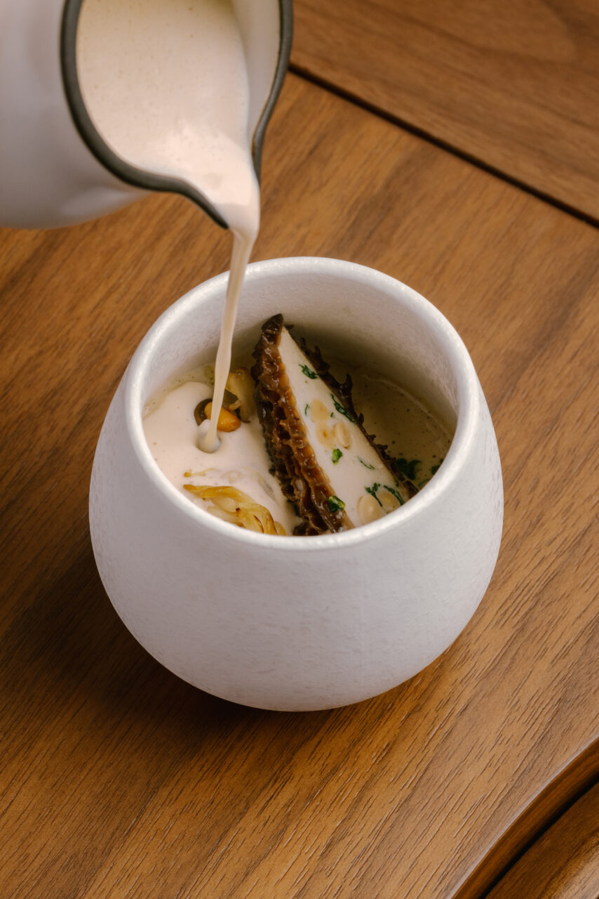 Executive Chef Joris has dreamed up 10 and 14-course dinner menus that brim with the multifaceted flavours of the season. Beetroot gets a spot in the limelight with a delicate dish that pairs the intensely earthy vegetable with beetroot powder-dusted croutons, velvety beetroot puree with fig leaf oil, and smoked bamboo shoot foam for added depth. A4 Wagyu Striploin is elevated through a layered arrangement that mimics the elegant structure of a mille-feuille. Strips of blaze mushroom and tung choi are nestled between bands of perfectly medium rare meat, whilst charcoal-finished celtuce gives a complementary crunch and potato crème fraîche brings a creamy finish.