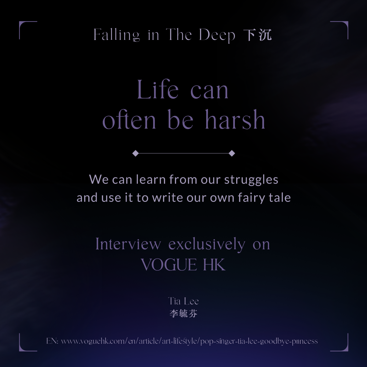 After swimming into the tunnel, the mermaid realises that her tail has transformed into a pair of legs. Her legs are now bleeding, turning the pristine blue waters red. Ashamed and shocked, she sinks deeper into the ocean, signifying a departure from the fairytale and moving into reality. Tia realises that in order to pursue her dream, she must overcome the fear in her heart, so the mermaid within can walk to the land to discover her own path. “My eyes brimmed with tears when I first watched this animation. These years in the entertainment industry have not been easy.” Tia continues, “I took a lot of blows and faced many false accusations and different challenges. Sometimes, I get tired and have thought about giving up, but this mermaid with a dream rekindled the flame within me.” Like the mermaid, young, naive Tia was fascinated by the glitz and glamour of show business and found herself in an abyss. What happens next? We’ll have to wait and see.