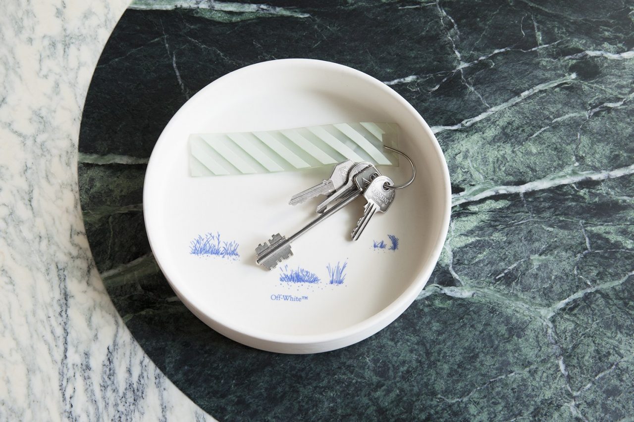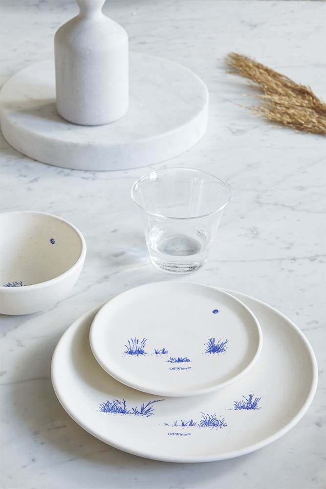 But color is not completely absent. All of ceramics are adorned with a grass landscape in cornflower blue—the same shade used across various pottery, from ancient Persian creations to Chinese porcelain, to Dutch delftware. “A lot of what I do is taking the familiar and making it new and that’s what we did here,” Abloh says. “It’s such a common thing, for plates and ceramics to have this sort of iconic blue element.”