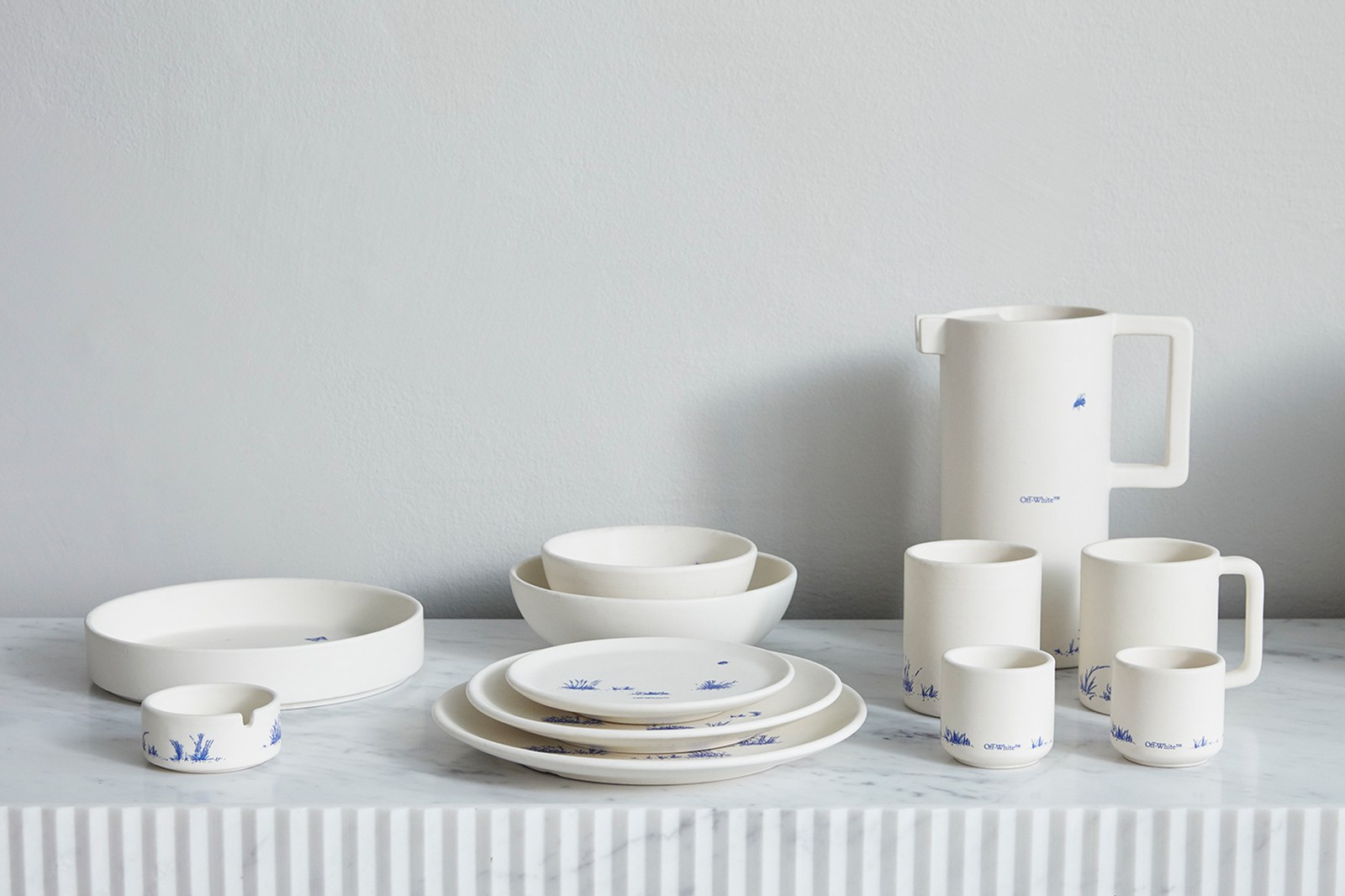 But color is not completely absent. All of ceramics are adorned with a grass landscape in cornflower blue—the same shade used across various pottery, from ancient Persian creations to Chinese porcelain, to Dutch delftware. “A lot of what I do is taking the familiar and making it new and that’s what we did here,” Abloh says. “It’s such a common thing, for plates and ceramics to have this sort of iconic blue element.”